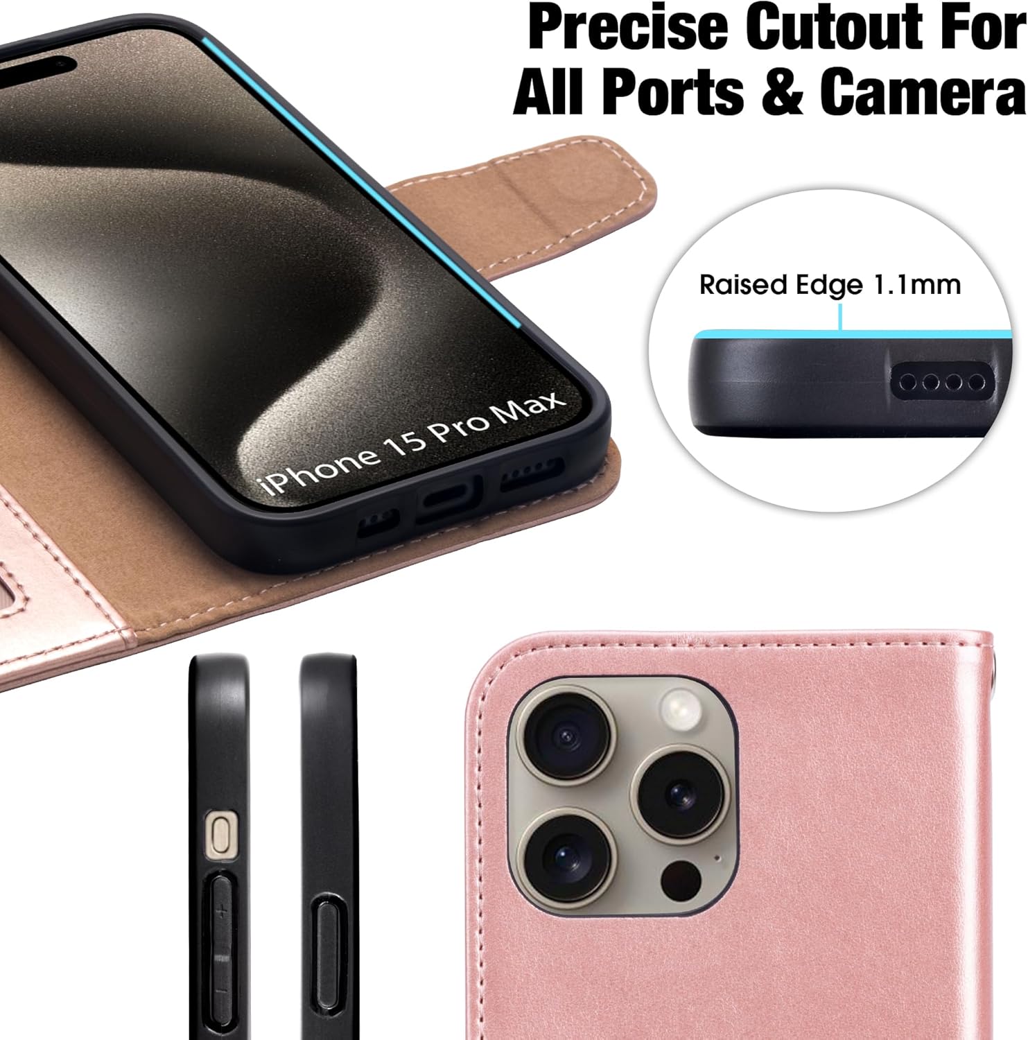 Arae Compatible with iPhone 15 Pro Max Case with Card Holder and Wrist Strap Wallet Flip Cover for iPhone 15 Pro Max 6.7 inch,Rose Gold
