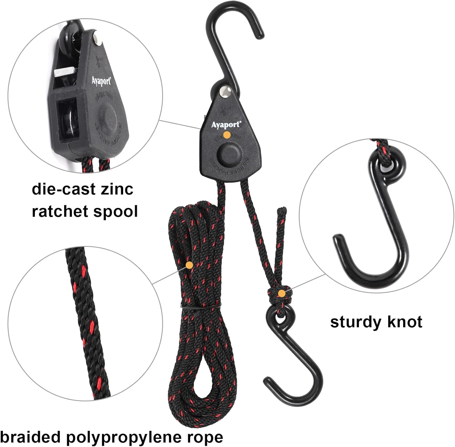 EXCELLENT WEIGHT CAPACITY. 1/8’’ diameter rope heavy duty ratchet system load capacity up to 75-pounds per piece; 150-pounds per pair.