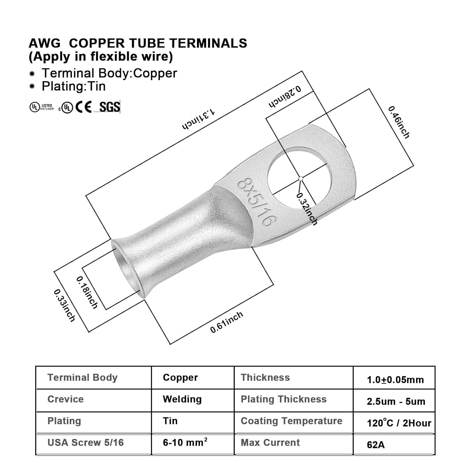 Battery Cable – iGreely 8 AWG 8 Gauge Wire Made with Tinned Copper Wire Battery Power Inverter Cables with 5/16″ Lugs Terminals for Solar Panel Automotive Motorcycle RV Marine 2ft/60cm