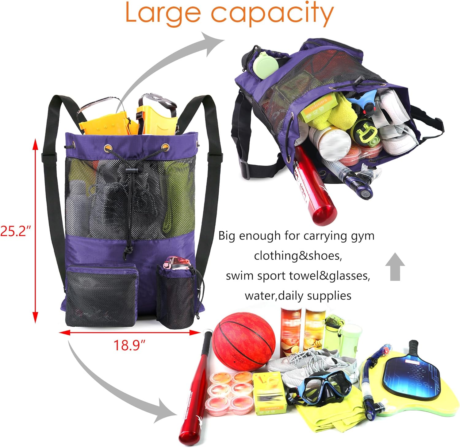Customers like the versatility of the bag. They say it’s a great work bag and perfect for holding a wet towel. They appreciate the water resistance, saying the mesh allows everything to dry. Customers also mention that it’ll allow the rain to pass all the way through. They find it easy to carry and light weight. They also appreciate the quality, saying it’d hold up well. Customers like that the bag is large enough to hold everything they need for swimming.