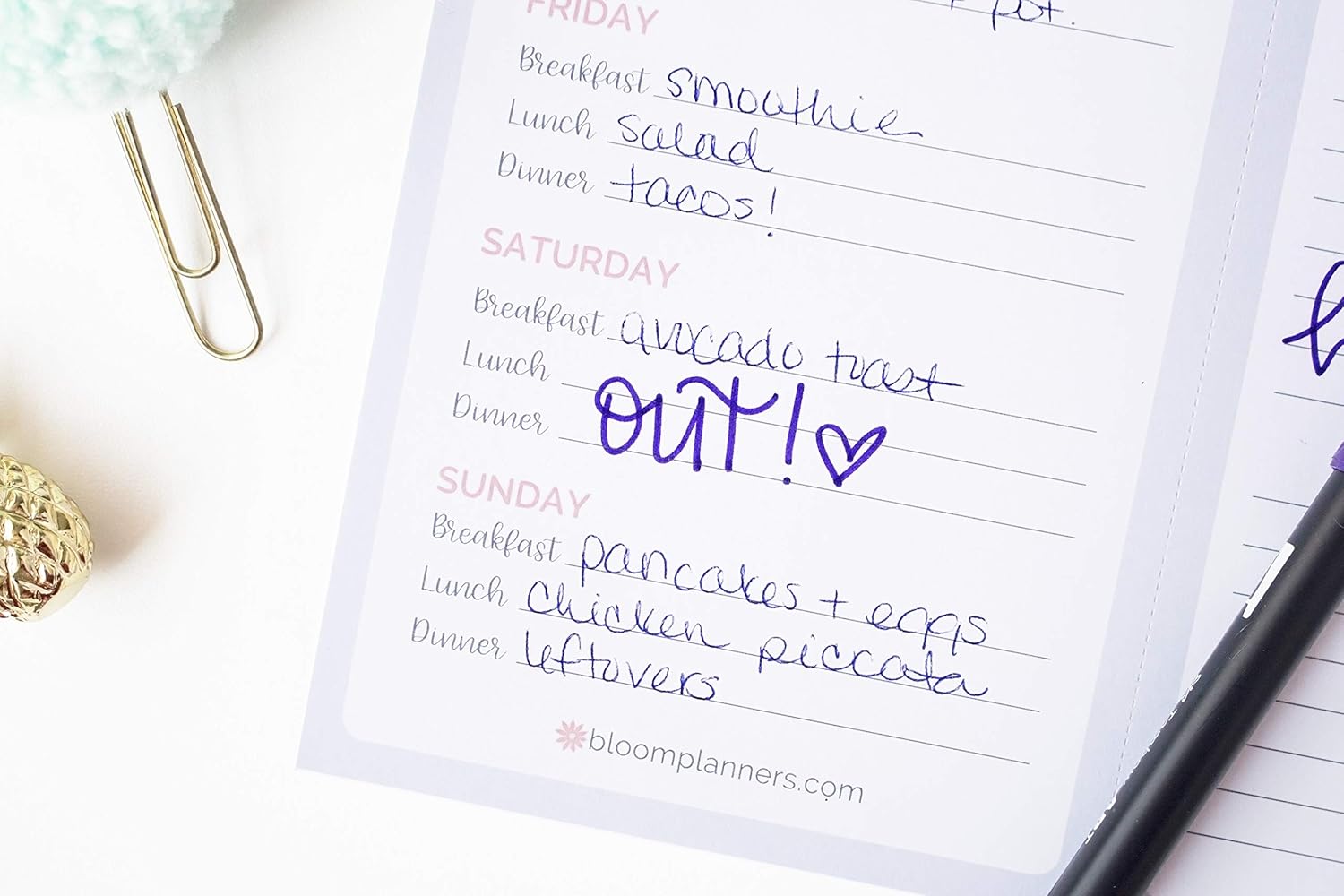 Left column features daily meal planning section, Monday through Sunday – plan out breakfasts, lunches and dinners for entire week