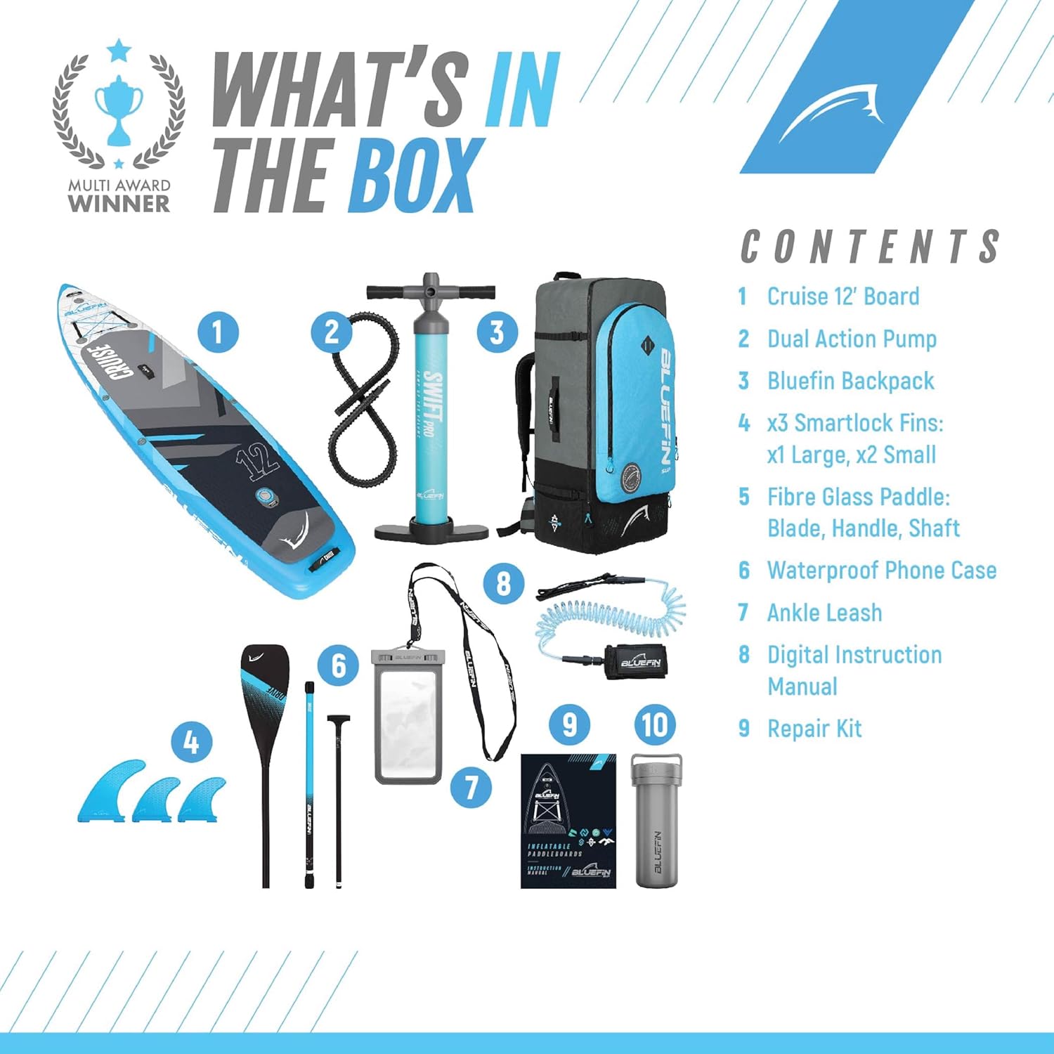 AWARD-WINNING DESIGN. Bluefin uses ESL fused PVC and the densest drop-stitch on the market for the most reliable, stable & versatile Stand Up Paddleboards. This comprehensive Bluefin Cruise SUP package has been built by SUP lovers for SUP lovers.