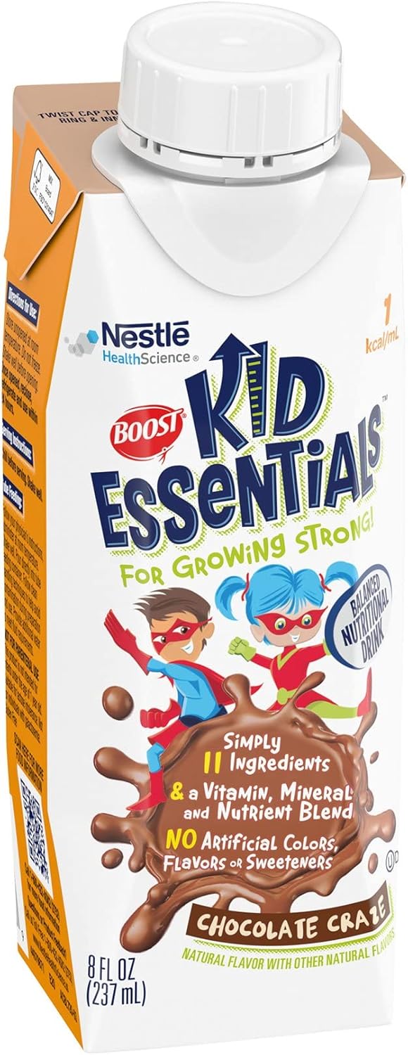 Boost Kids Essentials (1.0 calorie) is specially formulated with 25 essential vitamins and minerals plus 7 grams of protein to help children get the nutrition they need. This product comes in kid-friendly packaging for children ages 1 – 13 and may be consumed orally.