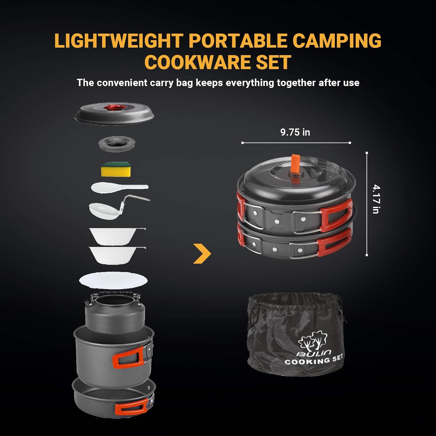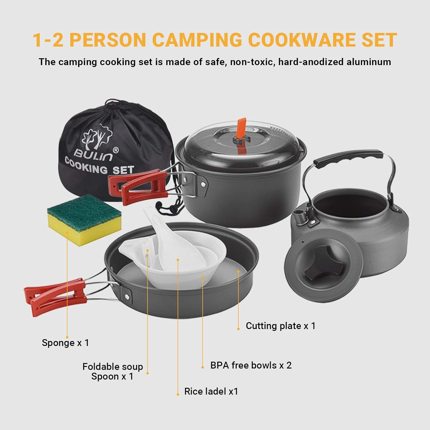 Bulin hard-anodized aluminum non-stick foldable camping cookware set, cooker set for 2-3 persons. COOKING PERFORMANCE: Hard-anodized aluminum, non-stick cookware set provides fast heating, which can cook your meals quickly.SAFE to USE:Heat-resistant handles to keep your fingers safe from the heat.