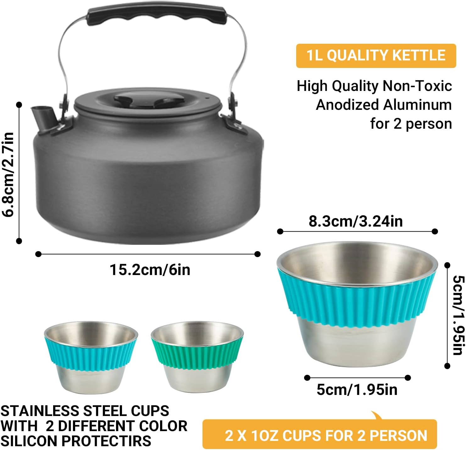 【20 PCS FOR 2 PERSON】camping cookware mess kit includes 1 frying pan+ 1 pot with lid + 1 tea kettle + 2 sets of stainless steel fork spoon knife + soup spoon + 2 cups + rice ladle + carabiner + sponge + carry bag