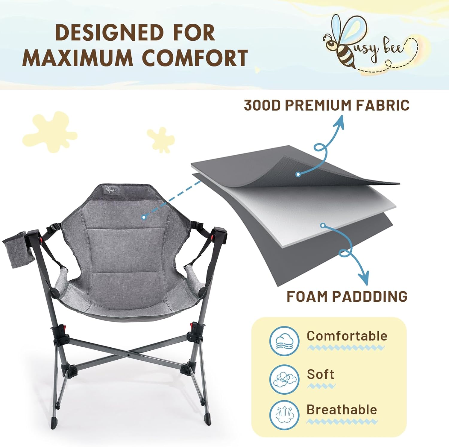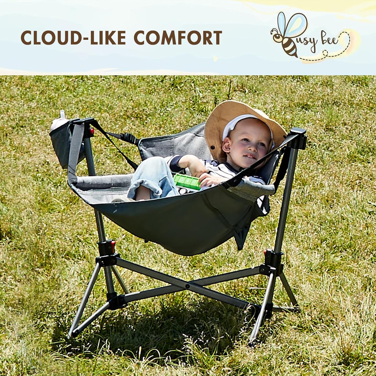 Busy Bee Folding Kids Stand, Child Camping Gear Hammock Swing Chair with Cup Holder & Carrying Bag for Outdoor, Lawn, Hiking, Indoor, Supports 125 LBS, Grey