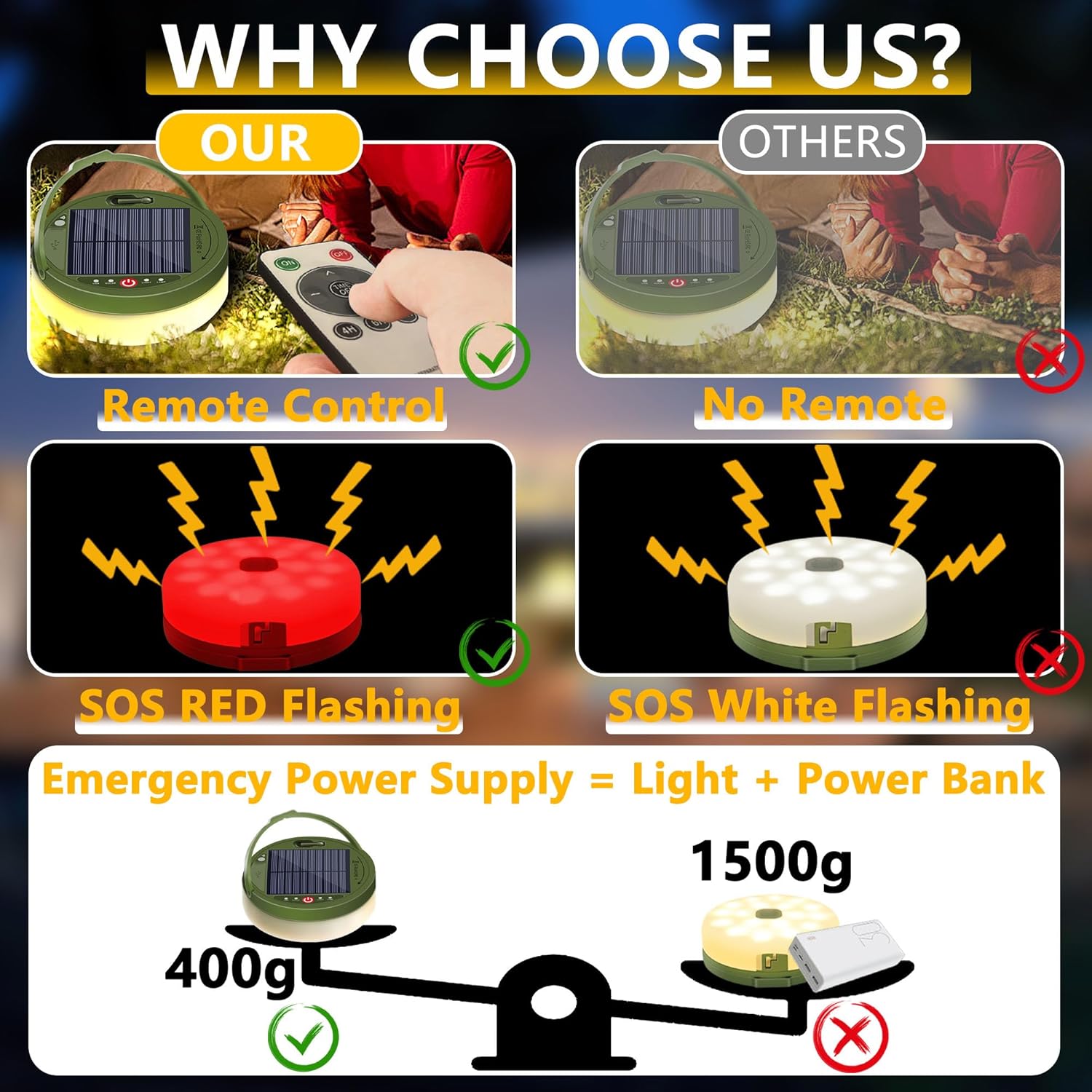 TENT LIGHTS FOR CAMPING WITH REMOTE : Lazy people Gospel! Remote control design so that this product can be remote control, what an interesting function to add! It’s such a gift and I can’t wait to own it!SOS RED LIGHTING: Compared to others camping lights, our eye-catching flash is red, very much in line with the habit of asking for help. What a human design!MOBILE CHARGING CAPABILITIES: In general, it can also be used as a power bank supply to power your iPhone, iPad or other devices. Charge your phone and other devices while off the grid with the USB charging port and included charging cable.