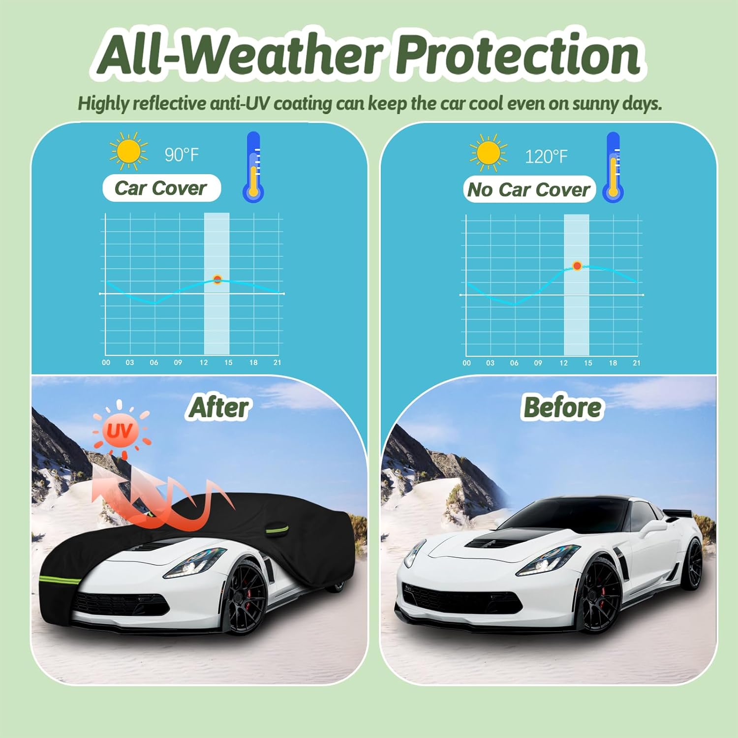 【All-Weather Protection】Made of 210T high-density polyester taffeta, the C7 car cover has excellent performance such as waterproof, heat-resistant and quick-drying. The outer layer is coated with waterproof coating to ensure that the car cover can withstand rain and snow. Highly reflective anti-UV coating can keep the car cool even on sunny days. The thicker cotton lining will protect the car paint better. Our heavy duty car cover will be more durable than other lightweight ones.
