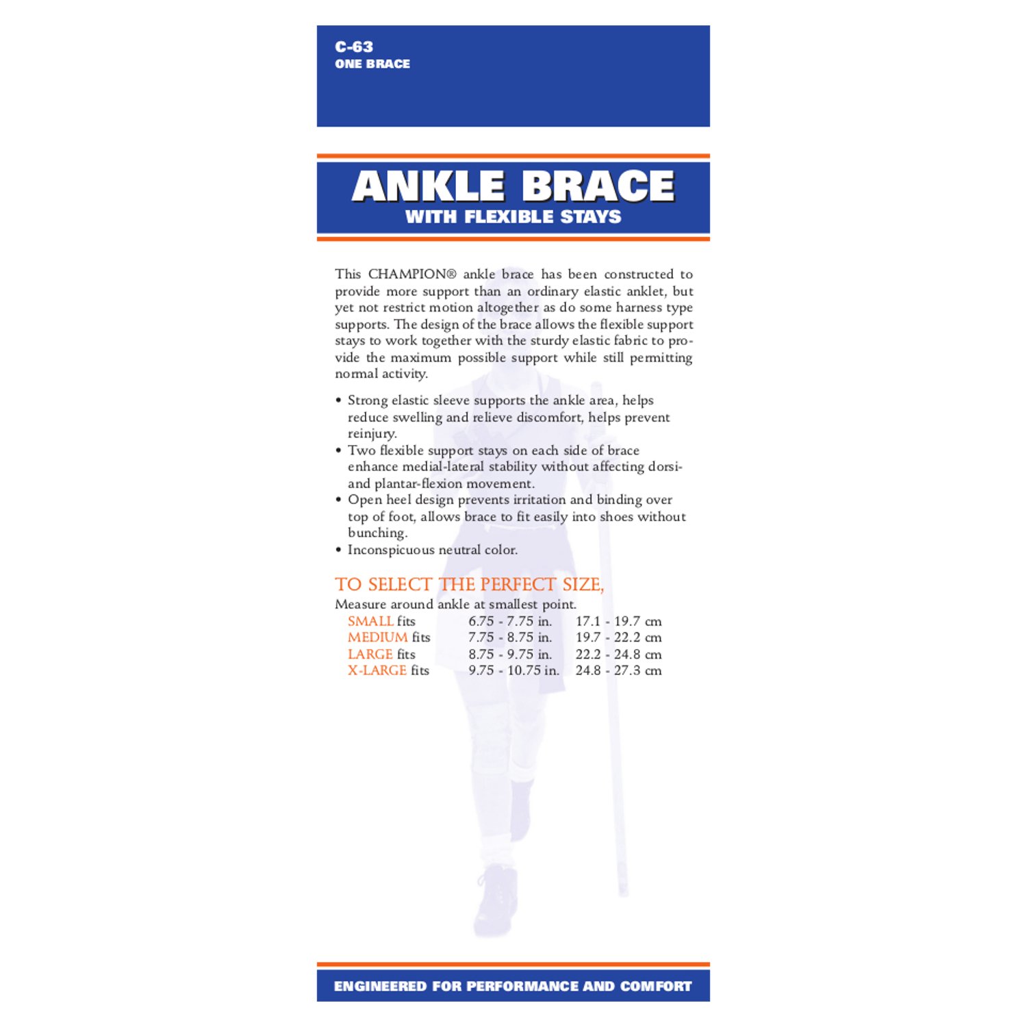 Champion brand (model C-63) ankle brace with flexible stays. Constructed to provide more support than an ordinary elastic anklet, but yet not restrict motion altogether as do some harness type supports. The design of the brace allows the flexible support stays to work together with the sturdy elastic fabric to provide the maximum possible support while still permitting normal activity. Use For: Acute ankle sprains, chronic ankle instability, post cast removal