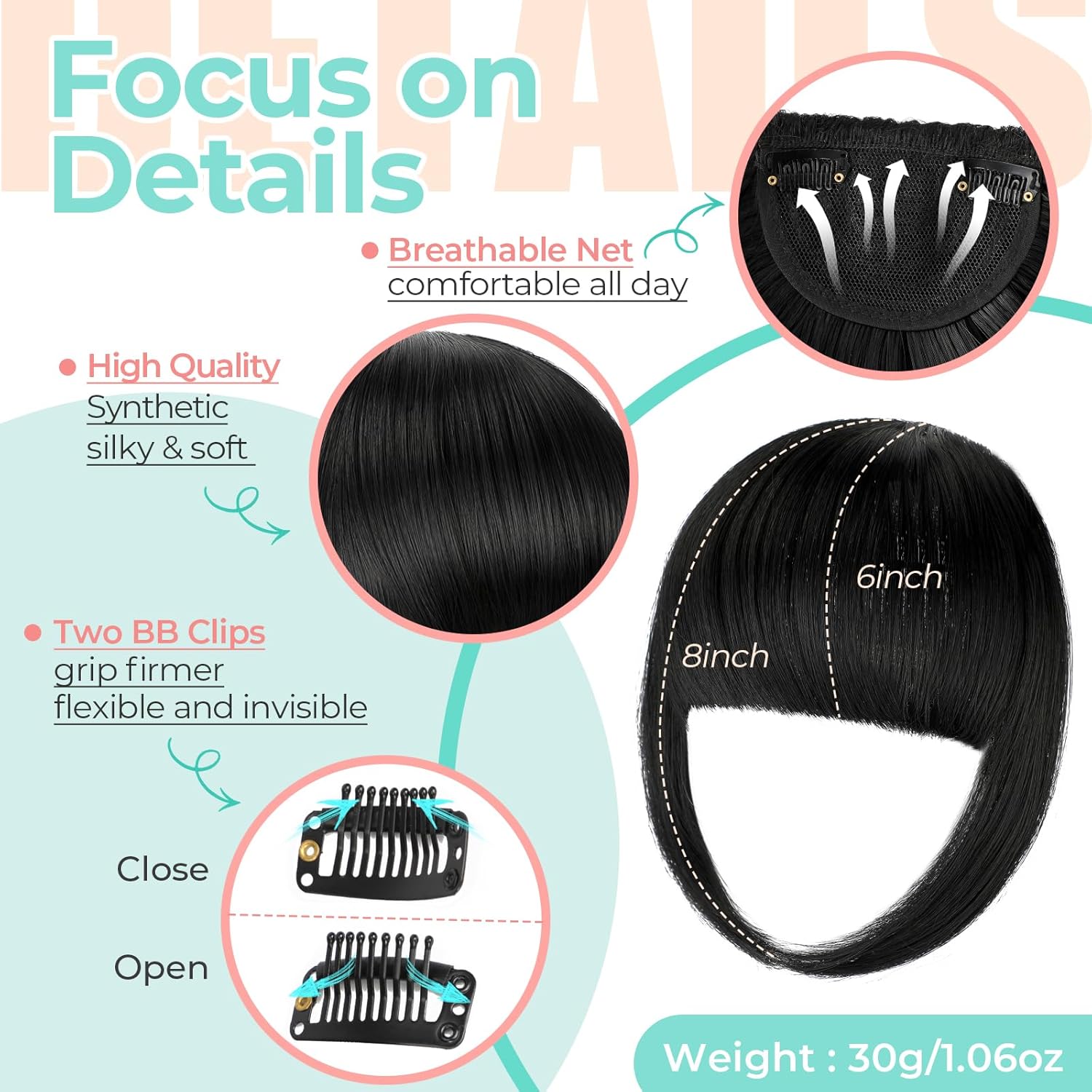 【Easy to Use】: The clip-in design makes it convenient to apply. Simply clip them onto your hair and adjust the position to achieve your desired style in seconds. Our French bangs are equipped with two sturdy and secure clips, ensuring a comfortable and slip-free fit, and avoiding the embarrassment of bangs falling off. They are easy to clean and maintain, ensuring they stay in optimal condition even with repeated use