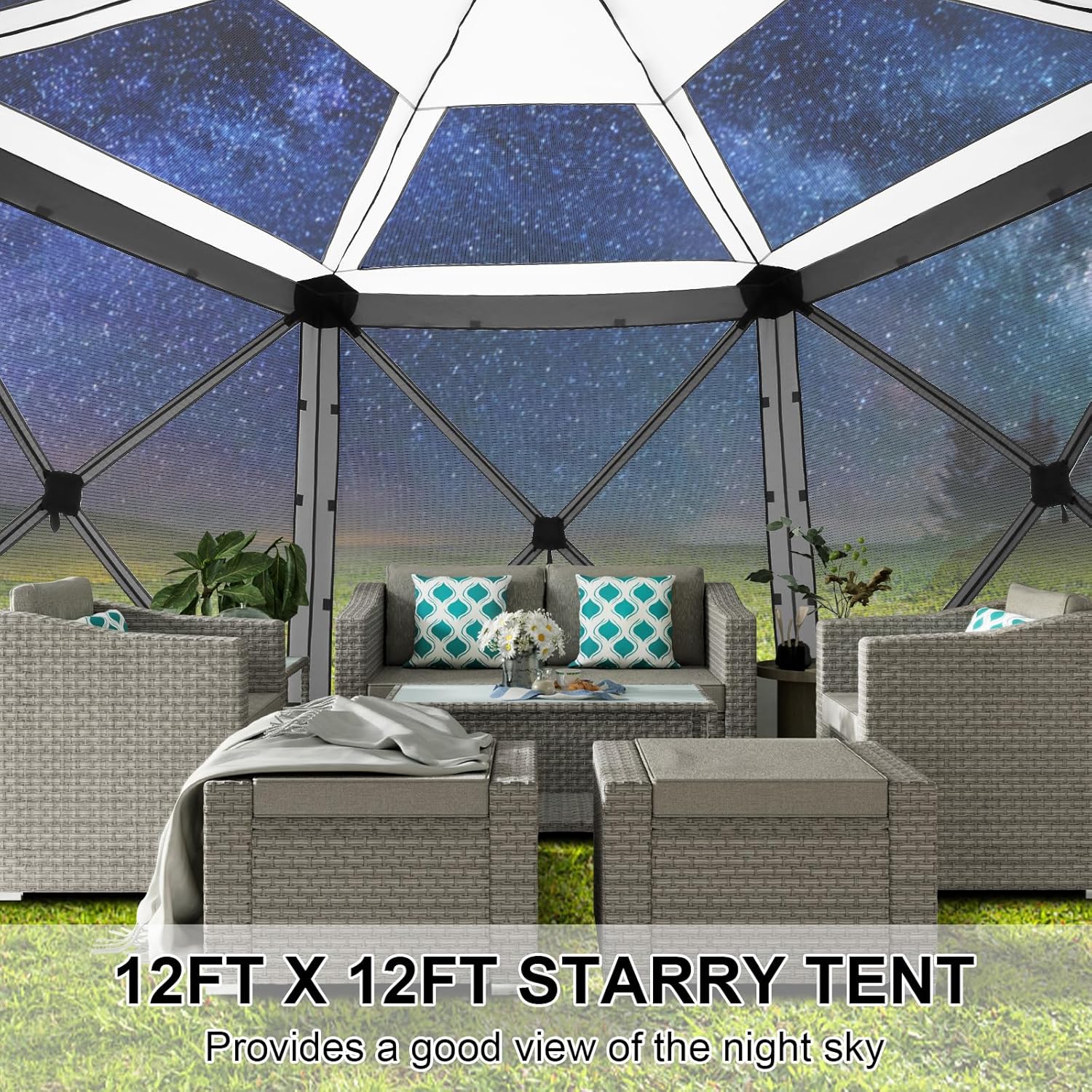 【Spacious and Comfortable】Our 12 x 12 foot camping tent is 90% ventilated and has plenty of room for up to 8 people and furniture, with high ceilings for plenty of headroom. The net roof starry sky tent allows you and your family or friends to watch the stars at night and enjoy leisure time.