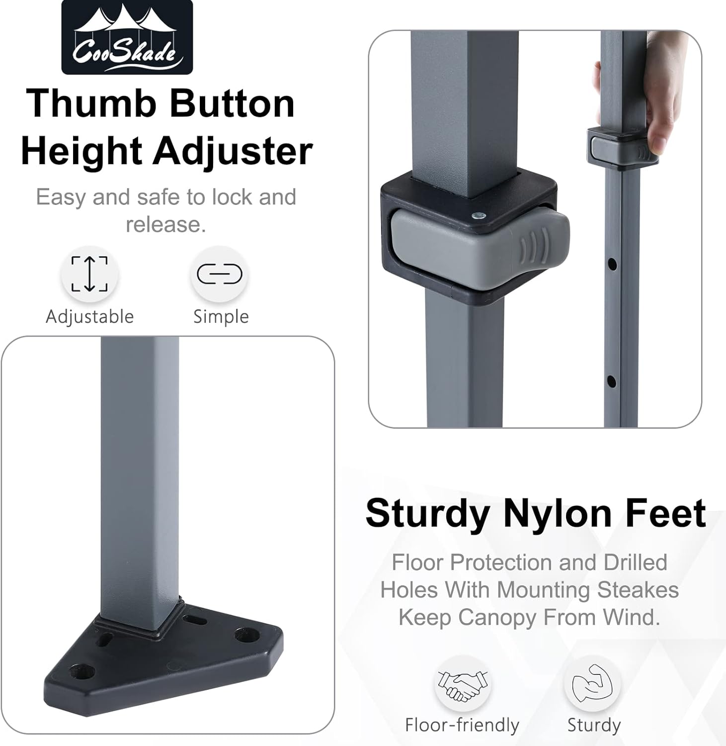 【EASY SETUP】The COOSHADE canopy tent is designed with fully assembled One-Piece frame in high gauge sturdy metal, no tools needed,seamlessly enables one-person set-up in one minute.Enjoy the shade quickly and easily under the sun.