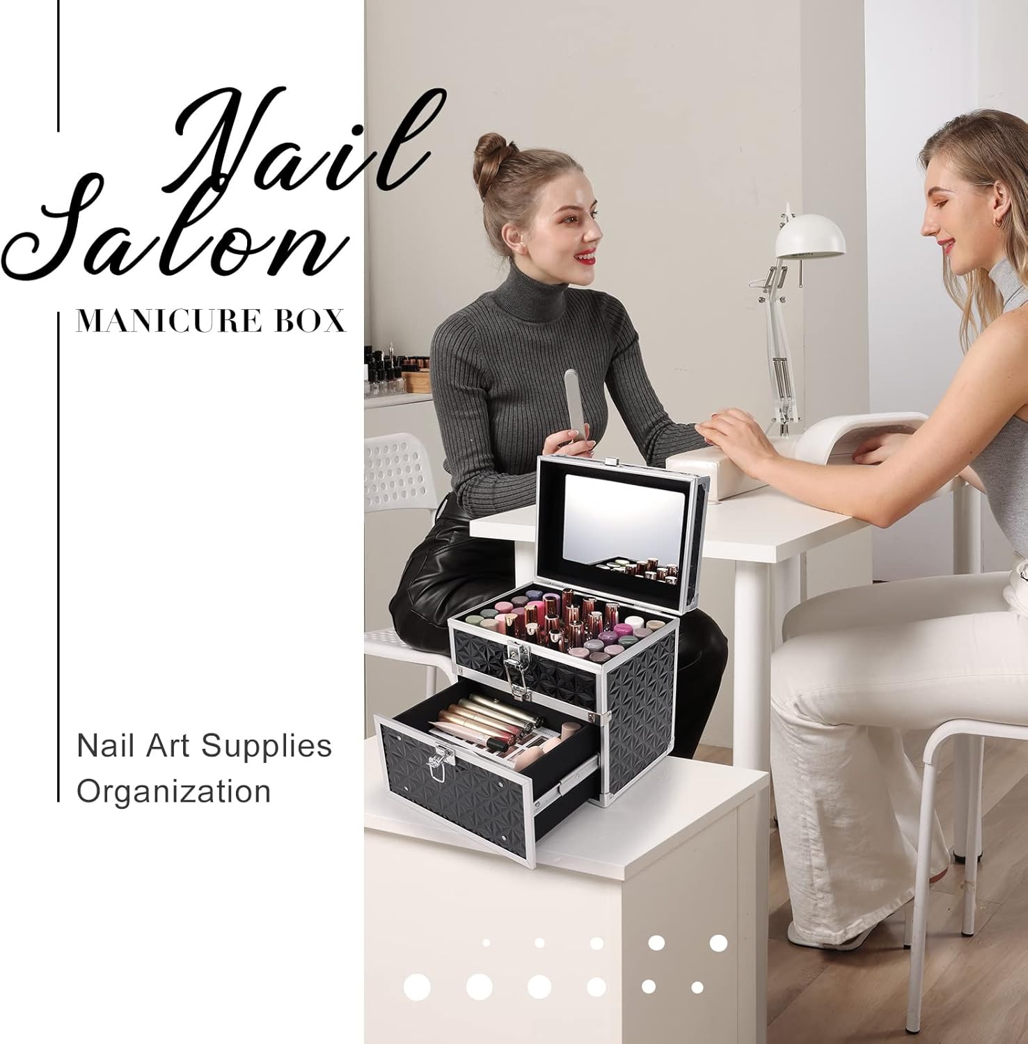 ## Nail Polish Organizer Case: The Nail Box Organizer Case is perfect for those who want to keep their nail supplies and makeup tools in one place. The functional structure of this case with drawer and mirror is impressive and allows for a versatile usage, making it an ideal addition to any beauty collection.