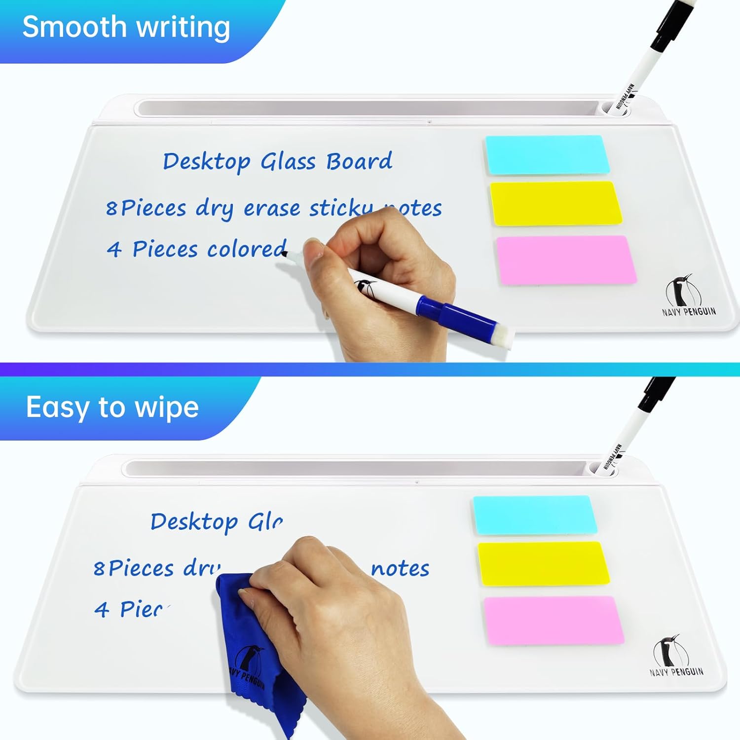 ✔ Premium Pack – this kit contains 1 tabletop glass whiteboard + 4 colorful dry erase markers + 8 colored sticky notes + 1 microfiber cloth. Smooth tempered glass surface for residue-free erasing.