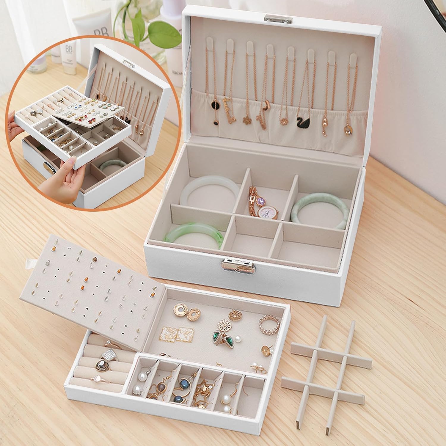 Multiple Compartments — The jewelry box has 89 small holes and 15 small compartments for earrings and rings; 6 larger compartments for bracelets,watches or bigger sized earrings; 8 hanger hooks for necklaces, chains. This double decker jewelry case keeps all types of jewelry pieces handy and separated.
