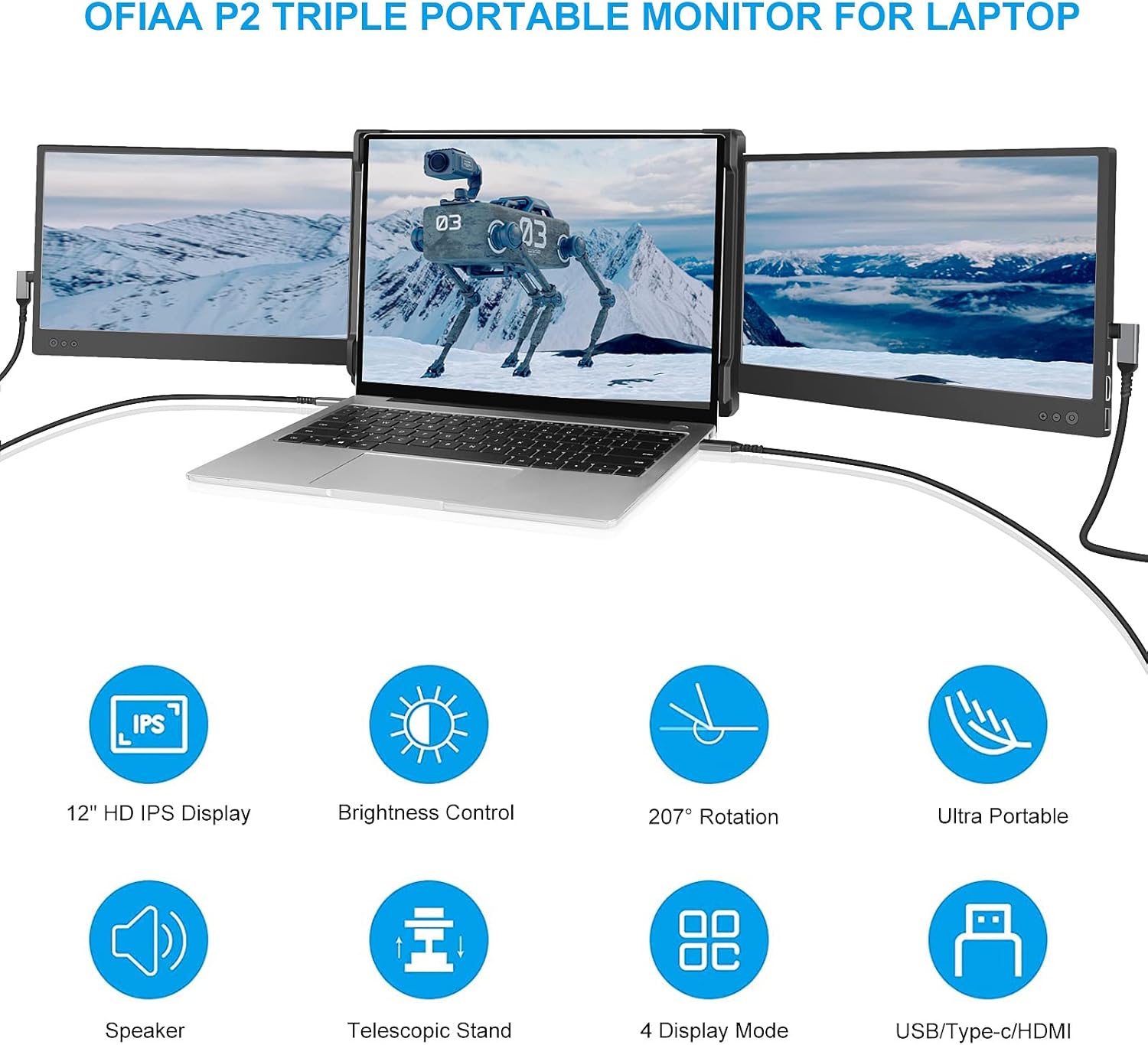 Dual Portable Monitor for Laptop, Triple Screen Extender for PC, 12 Inch 1080P Extra Laptop Screens for 13″-16″ Mac Windows Chrome Laptops