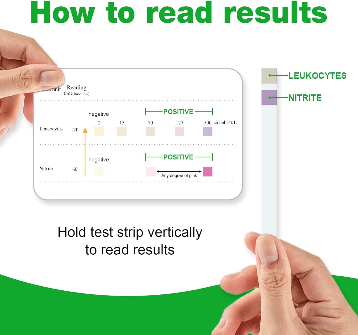 ✅Easy to Use: Easy@Home Urine tract infection test strips are simple to use. To perform the test, dip the strip in a urine sample for about 2 seconds and then wait for 2 minutes. Users can refer to a color chart to interpret the results. This color chart provides an easy-to-read visual guide that indicates the presence or absence of nitrites and leukocytes in the urine sample.