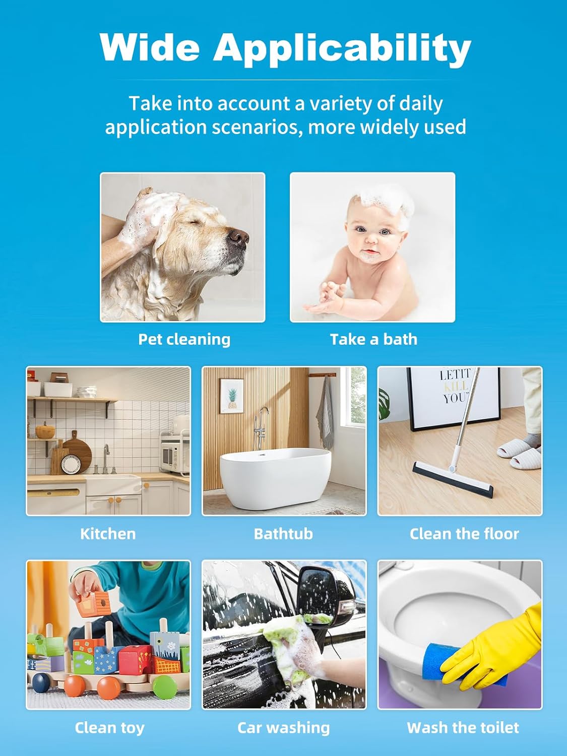 Versatile Compatibility: Works seamlessly with various cleaning supplies like dog shampoo, body wash, dish soap, bathroom cleaner, and bathtub cleaner. Just add your preferred detergent to the dispenser and dilute as required, reducing detergent consumption. The typical dilution ratio is 1 part detergent to 4 parts water, with flexibility for adjusting ratios based on different detergent types