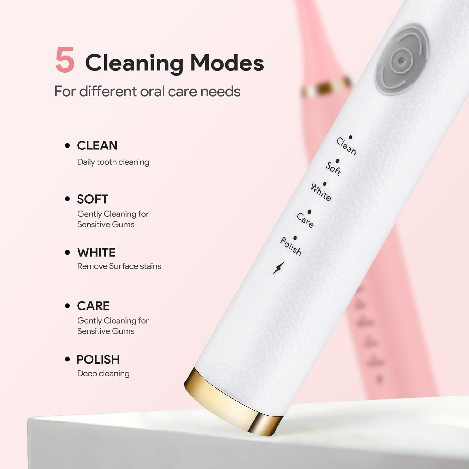 [Five Brush Modes] Choose from five different cleaning modes – Cleaning, White, Polish, Sensitive and Care – to personalize your brushing experience. Address specific oral care needs for a thorough and comfortable clean.