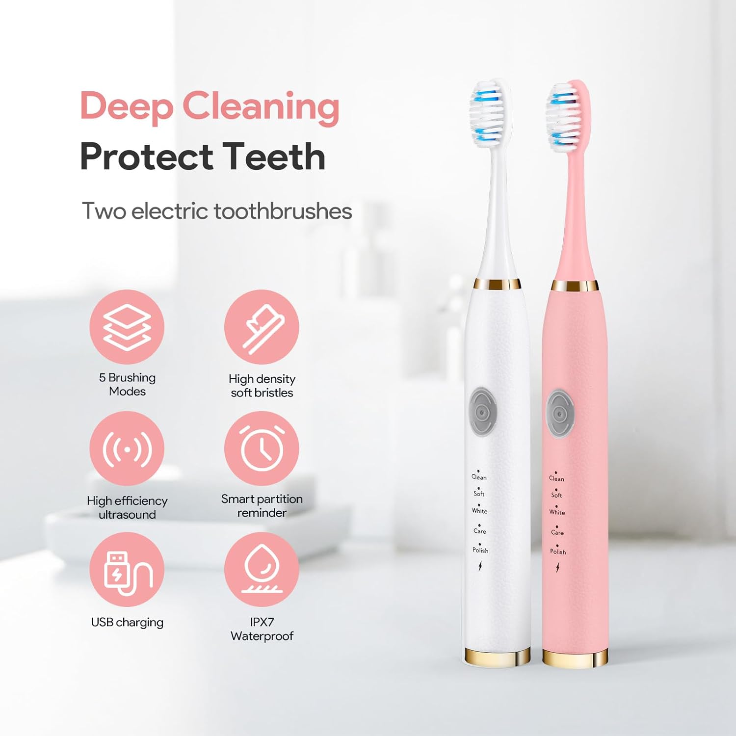Electric Toothbrush 2 Pack, Travel Electric Toothbrush for Adult Includes 10 Replacement Brush Heads, 5 Modes, 2 Hours Charge for 60 Days (White & Pink, 2 Pack)