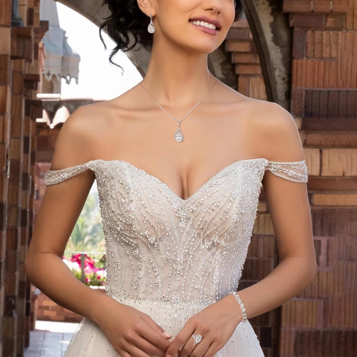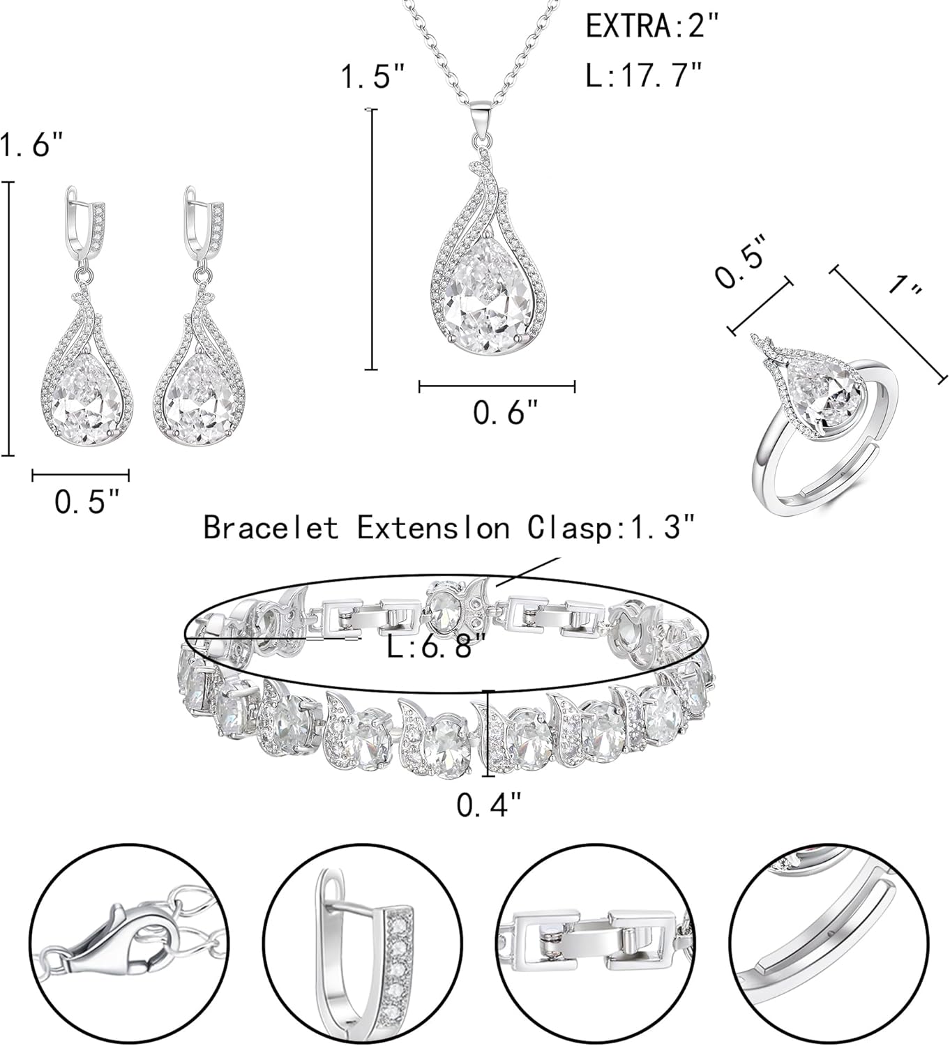 EleQueen Bridal Wedding Jewelry Sets for Bride Bridesmaid, Cubic Zirconia Silver-Tone Teardrop Crystal Pendant Necklace Dangle Earrings Open Rings Set for Women