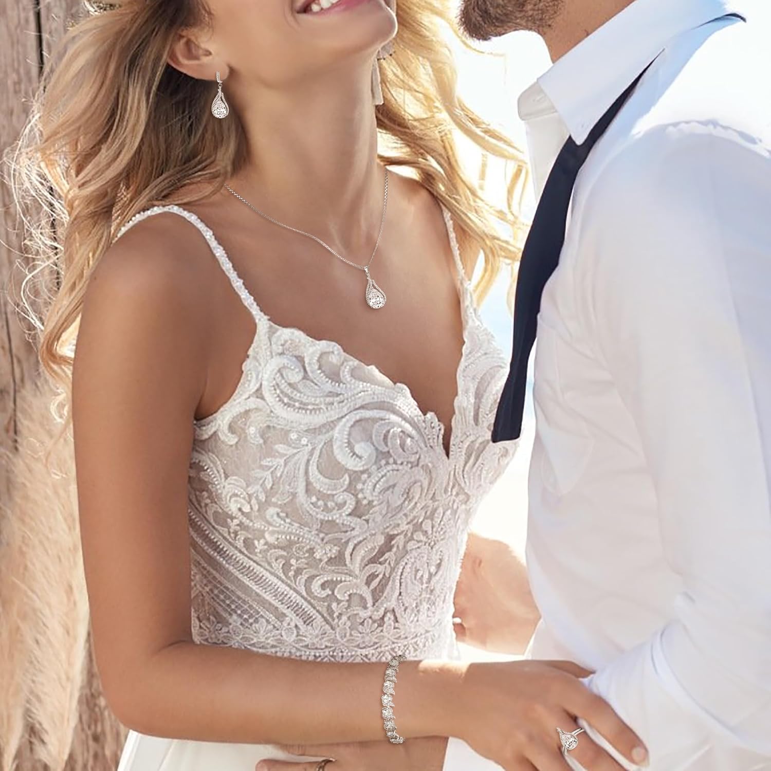 EleQueen Bridal Wedding Jewelry Sets for Bride Bridesmaid, Cubic Zirconia Silver-Tone Teardrop Crystal Pendant Necklace Dangle Earrings Open Rings Set for Women