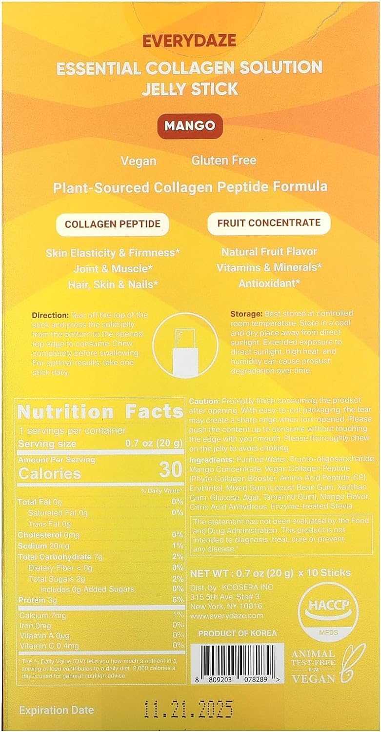 EVERYDAZE Essential Collagen Solution Jelly Stick | Vegan Collagen Peptide | Mango | 10 Packs | Hair, Skin, Nails, Beauty, Bone, Joint Health | Vitamins, Minerals, Antioxidants for Men & Women