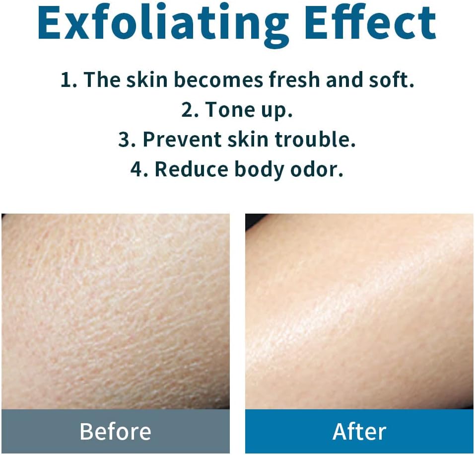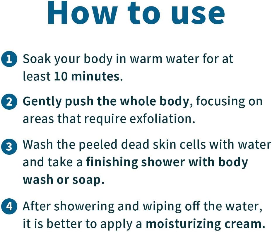 Full Body Bath – When taking a bath or shower, we recommend using this towel on your shoulders, legs, thighs, back, feet, and arms, where a lot of dead skin cells accumulate for a deeper wash. Wet your body in lukewarm water, then gently massage your skin. Apply enough force without pain to gently exfoliate and enjoy the bath.