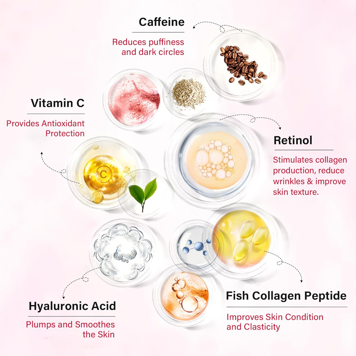 Retinol stimulates collagen production and improve skin texture and firmness.Caffeine is known for its ability to reduce puffiness and dark circles. Hyaluronic acid is a powerful hydrator that helps to plump and smooth the skin, reducing the appearance of fine lines and wrinkles. While Vitamin C provides antioxidant protection and improve the skin tone.