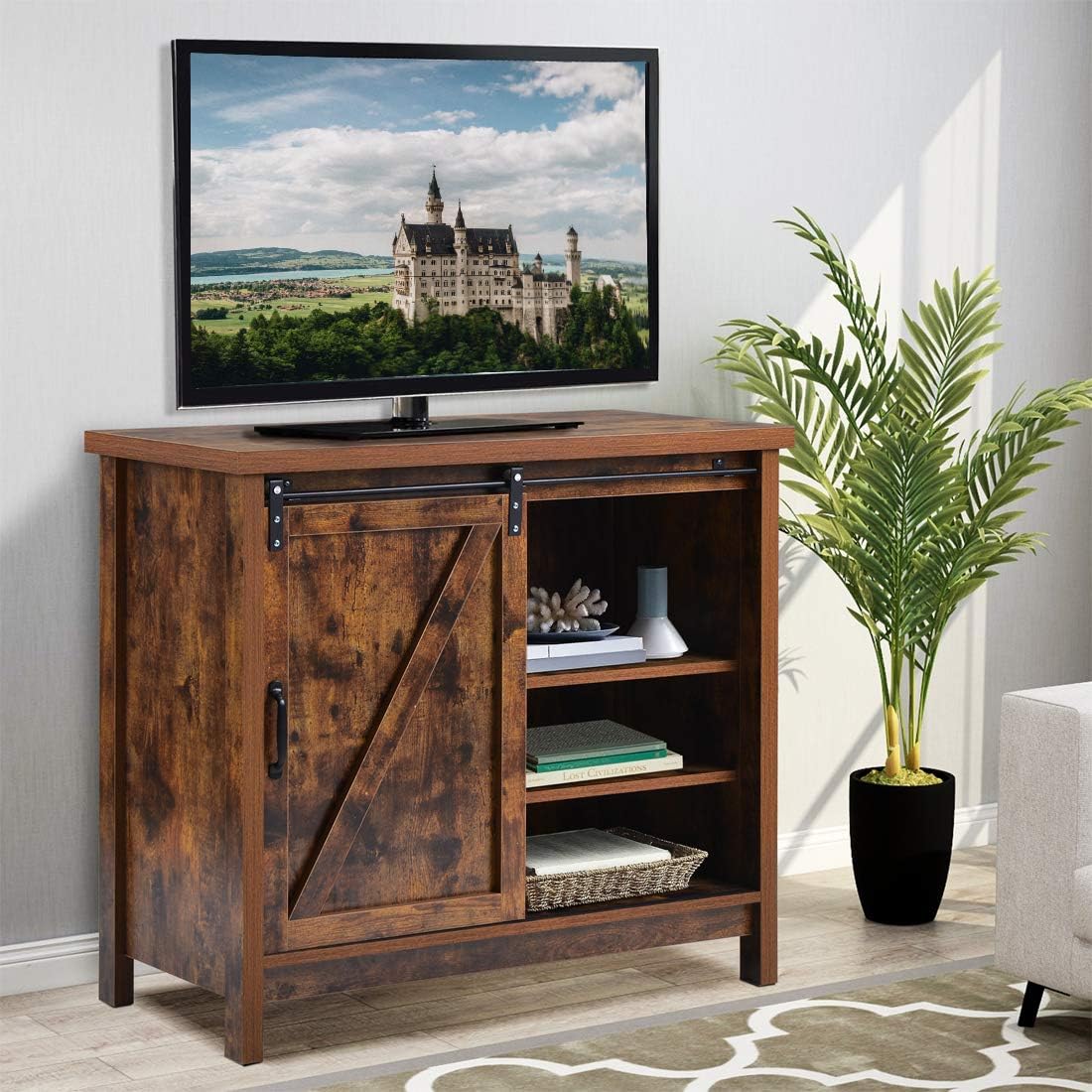 Farmhouse Wood TV Stand, Sliding Barn Door TV Stand 31.4” Tall Media Console Table with Storage Shelves for TV’s Up to 65″ for Home Office Easy Assembly Adjustable Universal Stand Rustic Brown