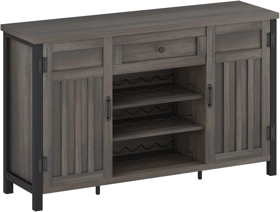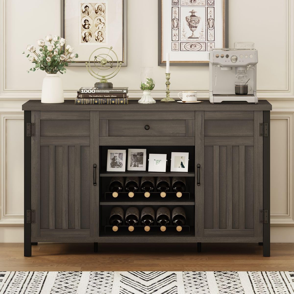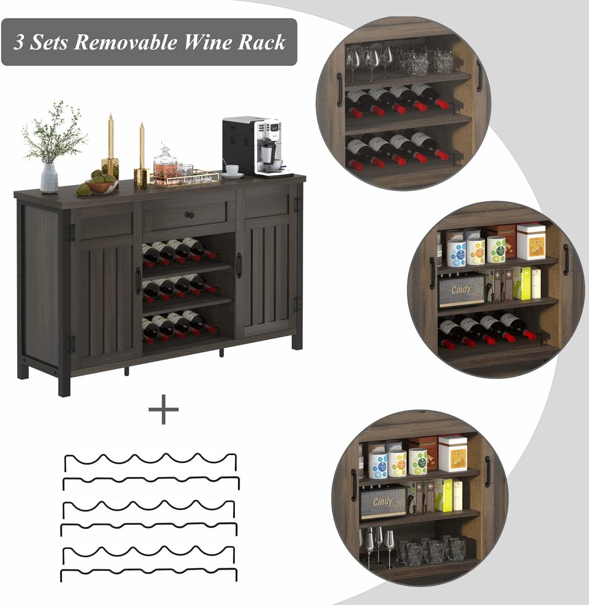 FATORRI Buffet Cabinet with Storage, Industrial Sideboard Storage Cabinet with Drawer, Farmhouse Kitchen Cabinet with Wine Rack, Rustic Wood Coffee Bar Cabinet for Kitchen (55.12 Inch, Walnut Brown)