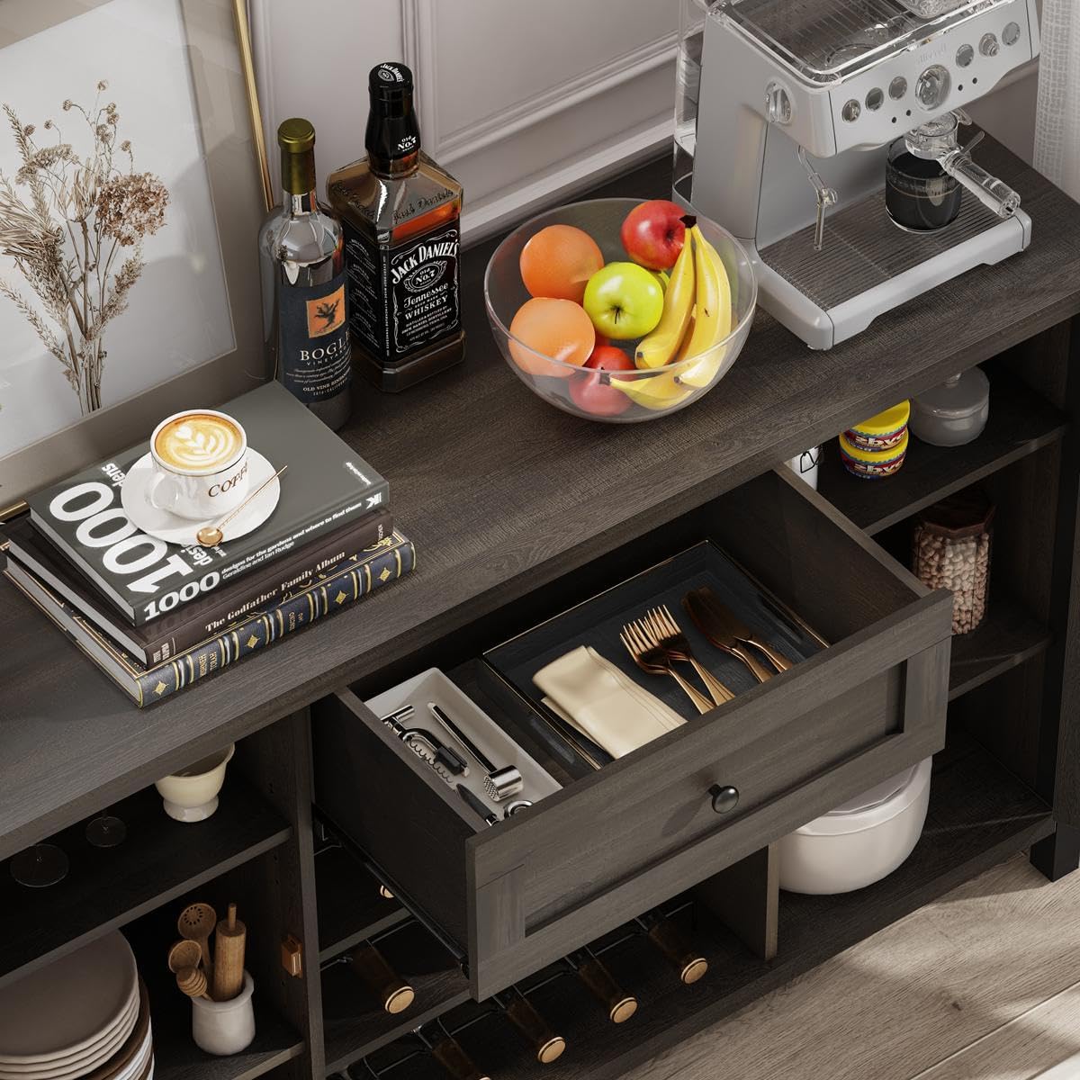 [Rustic Buffet Cabinet with Wine Rack]: There are endless possibilities with this sideboard cabinet to maximize your space. 2 wood doors open to reveal 4 adjustable shelves and ample storage space, while a center drawer is ideal for storing cutlery and other dining supplies. The 3-layer open shelves, each equipped with a removable wine rack, allow you to display your liquors. Ample surface space is the perfect spot to show off your wine and glasses, coffee maker, dishes, candlesticks, etc.