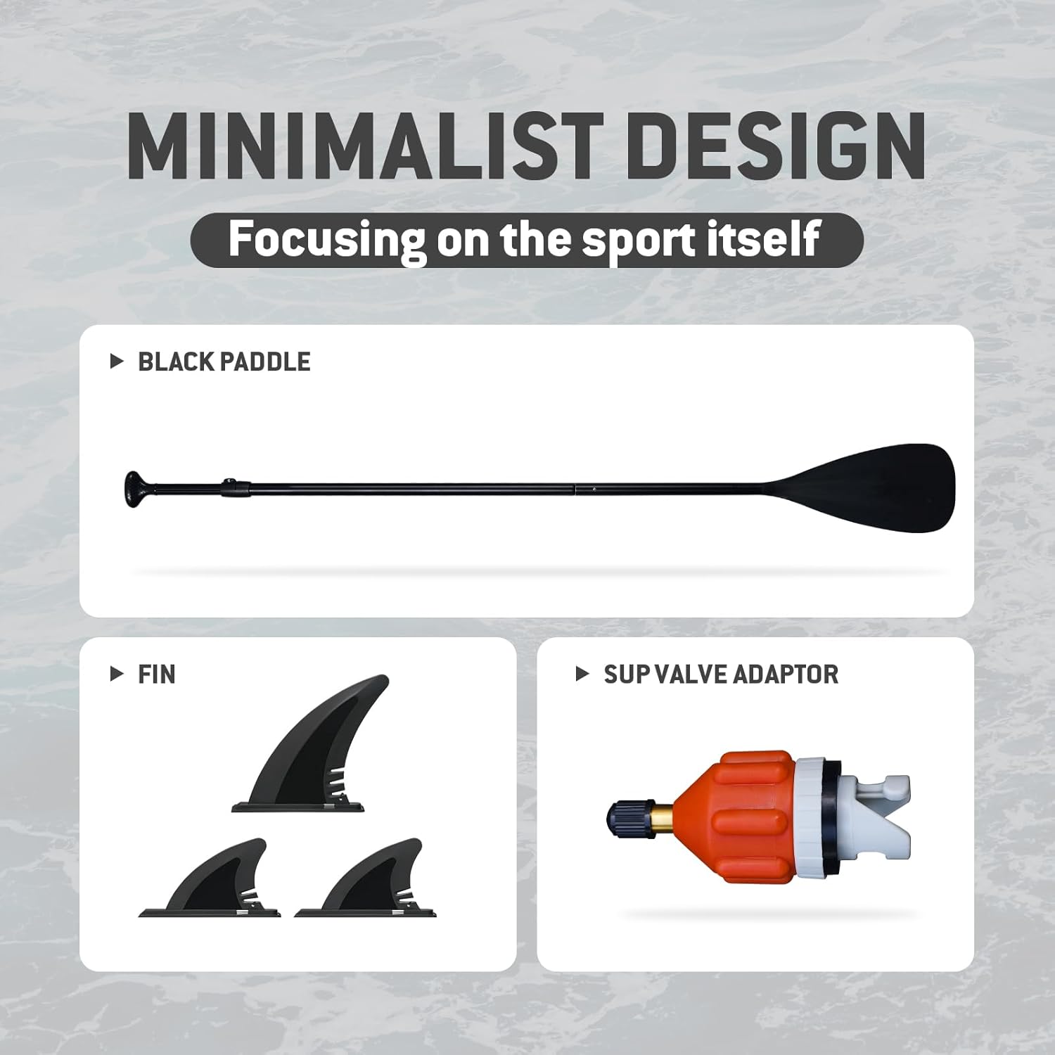 【Package includes】1 inflatable paddle board, 1 adjustable super paddle, 3 fins, 1 air valve adapter, and 1 repair kit. (Package contents are subject to pictures)