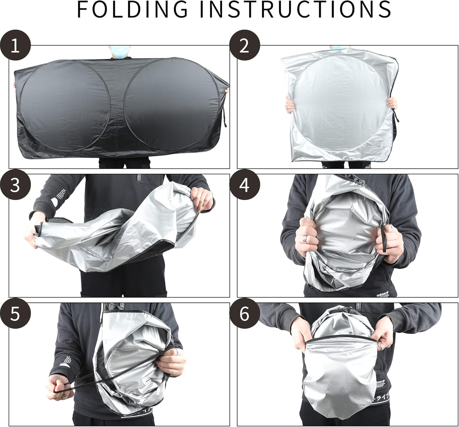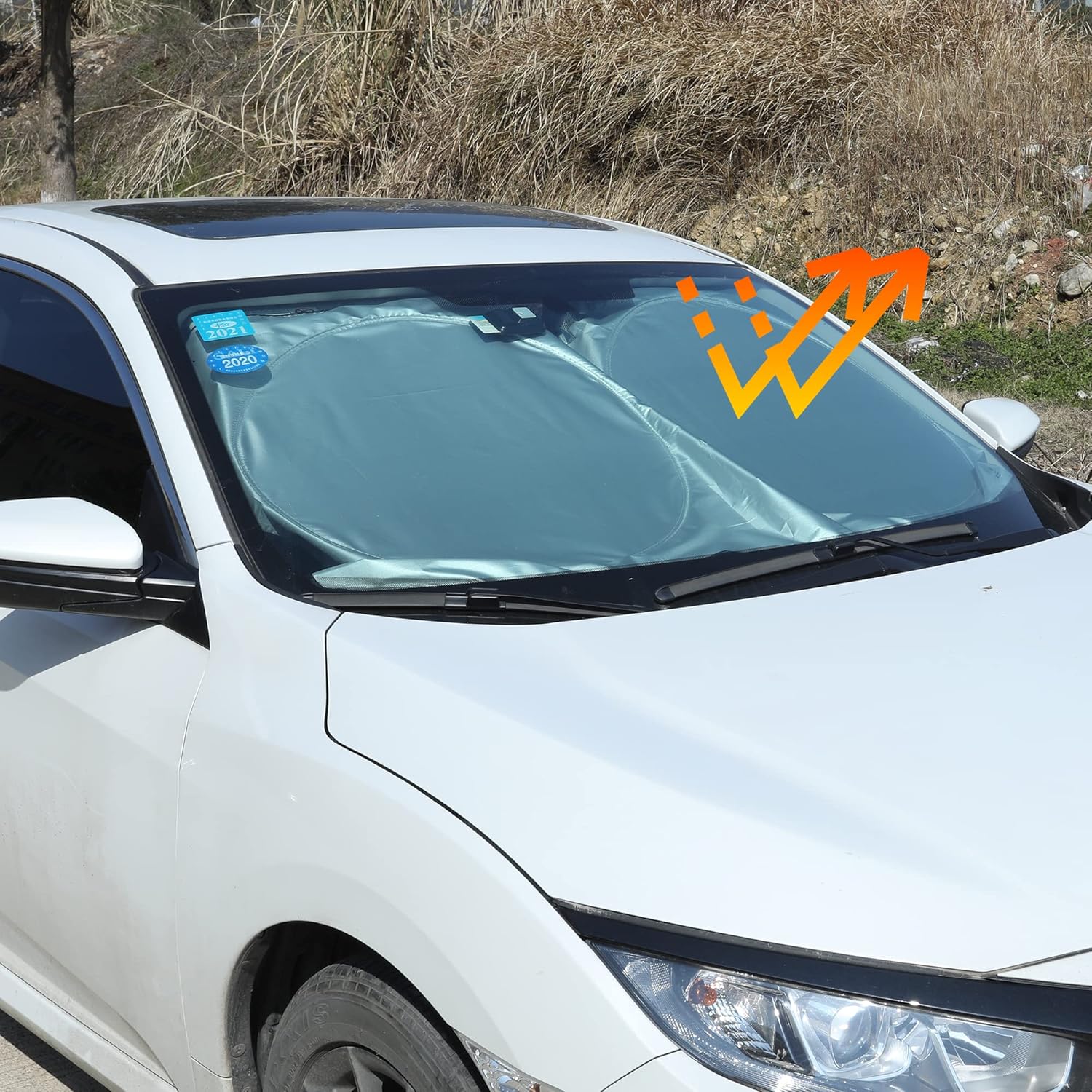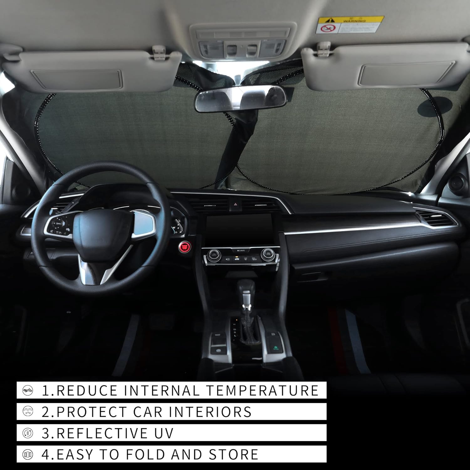 ☀ 𝗣𝗥𝗘𝗠𝗜𝗨𝗠 𝗖𝗢𝗠𝗣𝗢𝗦𝗜𝗧𝗘 𝗠𝗔𝗧𝗘𝗥𝗜𝗔𝗟𝗦: The sunshade is made of high-density multi-layer material, Silver reflective, and Black insulation fabric inside, Effectively blocks sunlight, ultraviolet rays, and heat; It significantly reduces the temperature inside, ensuring comfort every time you step in
