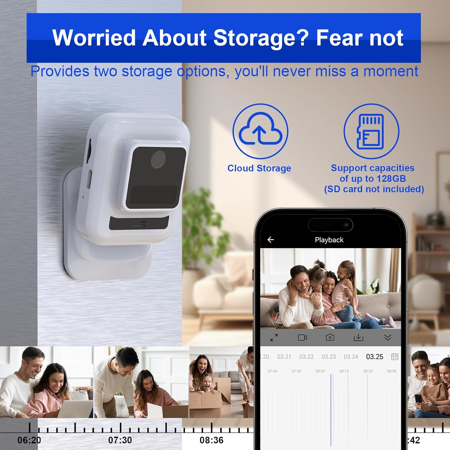 [Remote Monitoring with PIR Motion Detection Mini Camera Wireless] Monitor your home remotely using the intelligent app compatible with phones and tablets. The security cameras wireless indoor’s upgraded Passive Infrared (PIR) sensor detects motion accurately and sends instant alerts with 1080P full HD video clips directly to your mobile device. These motion-triggered videos can be stored locally on an SD card (supports up to 128GB, not included) or in the cloud for up to a 7-day free trial period. You also have the option to upgrade your cloud storage plan, ensuring that you always have access to critical footage.