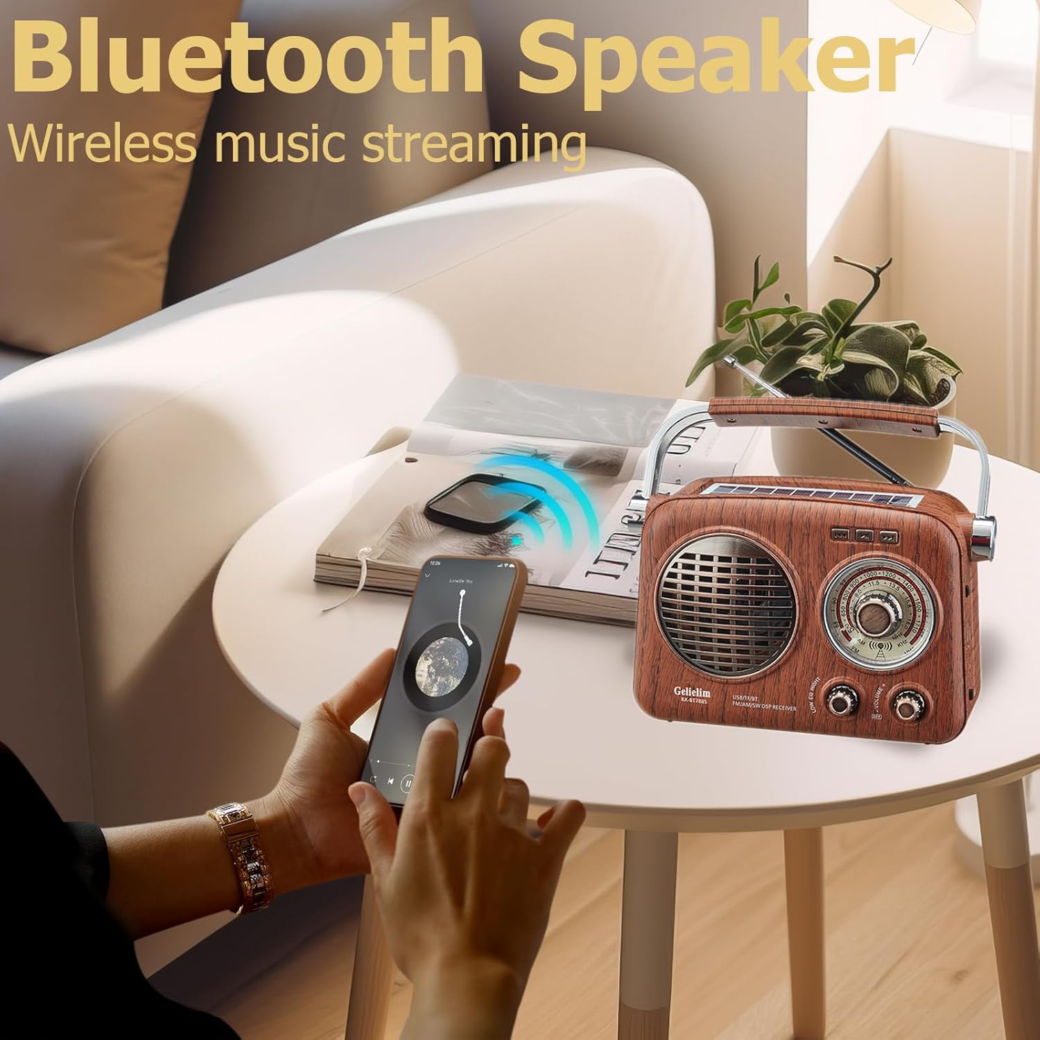 Gelielim Radio Portable AM FM Shortwave,Vintage Radio Bluetooth Speaker with Crystal Clear Sound, Rechargeable Battery Powered Radio, Small Radio with Solar Panel & Flashlight, Small Gifts for Senior