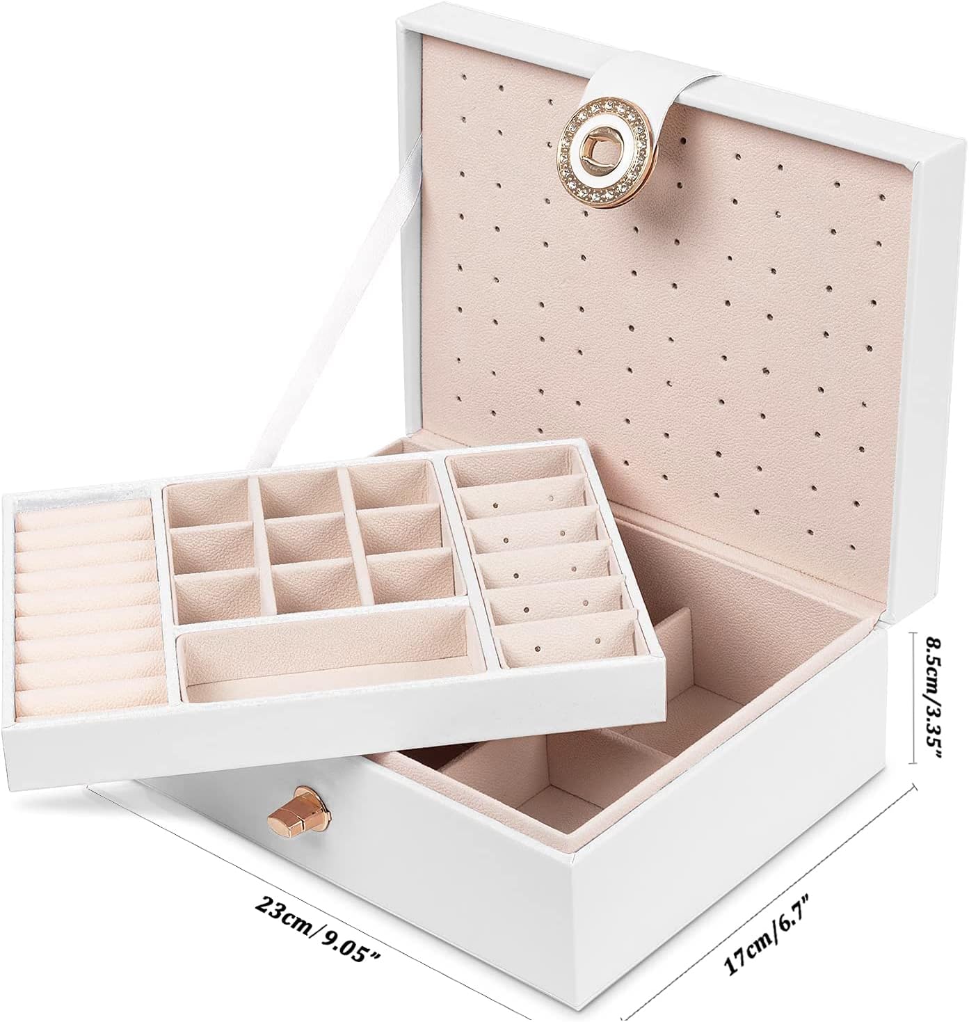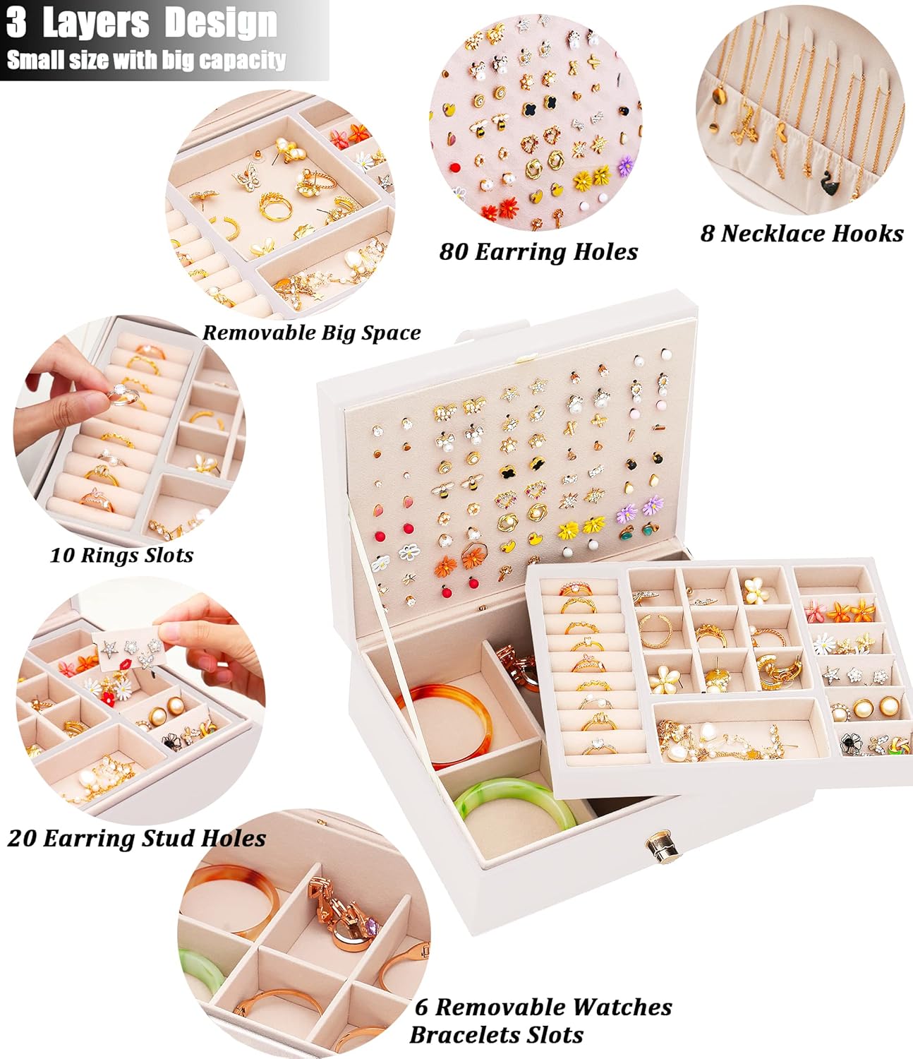 8* Necklace Holder Hangers1* Big Jewelries Pocket105* Stud Earring Holder Organizer Holes10* Rings Holder Case9* Removable Big Rings Organizer Case1* Bangle Bracelet Organizer case6* Removable bracelet holder caseDivided necklace earring box jewelry boxes for women jewelry organizer with earring holes——-QBestry girls jewelry box for earring for woman can protect all your beloved jewelries in safe. a perfect girls stud earring organizer rings and chain jewelry box teen girls.jewelry organizer for stud earrings—–Girls earring box for earrings and rings jewelry organizer for girls has multi-layer ensure this jewelry organier box for girls meet your daily use.