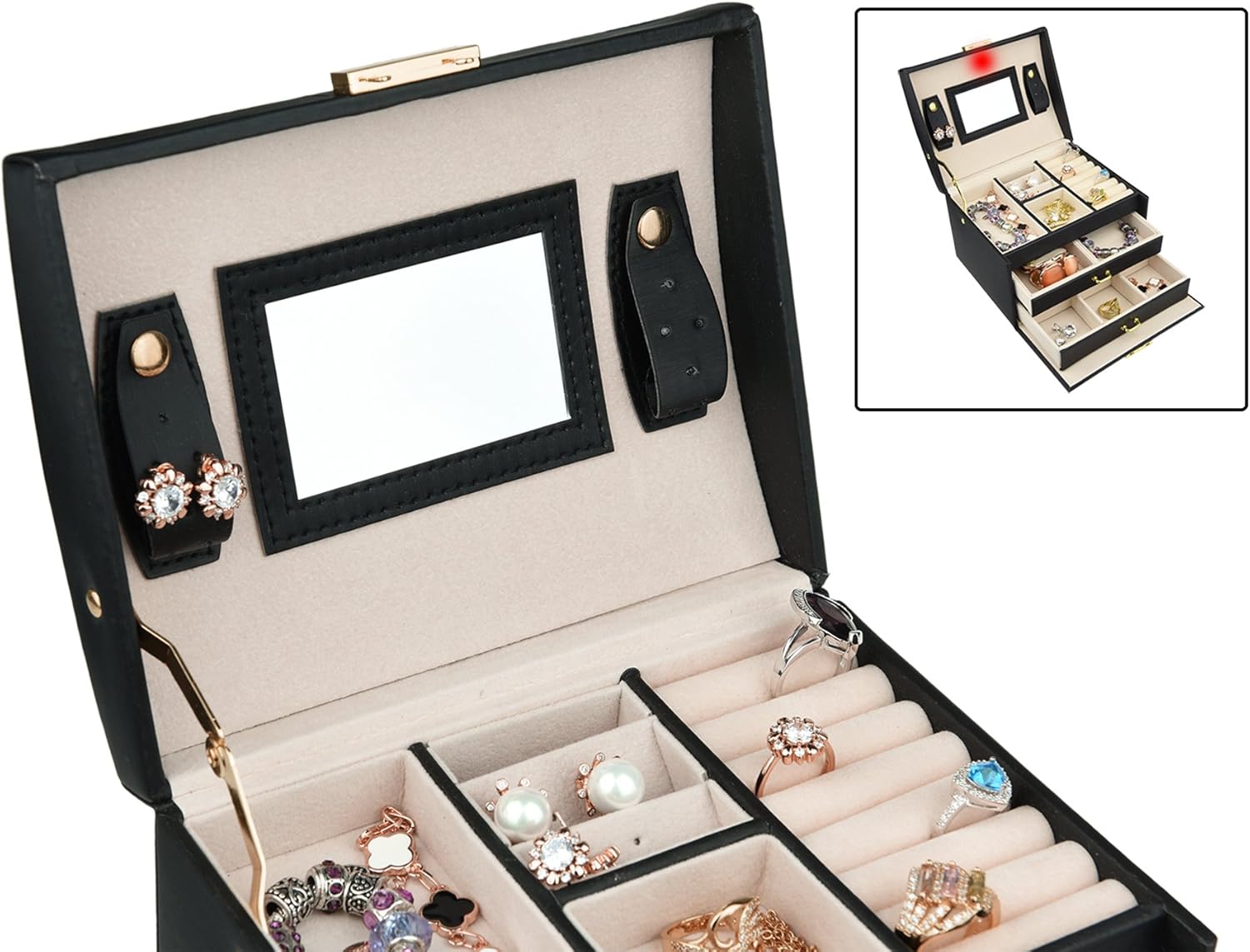 MULTIFUNCTIONAL COMPARTMENTS : This jewelry box is special 3 layer design for all types of jewelry. Earrings slots, rings slots, necklace hooks, large compartments for watches & bracelets and brooches,extra storage pouch and adjustable dividers . Let you store a plethora of sparkling rings, necklaces, studs, and hairpins—whether you’re an avid connoisseur or new to jewelry collecting fun.