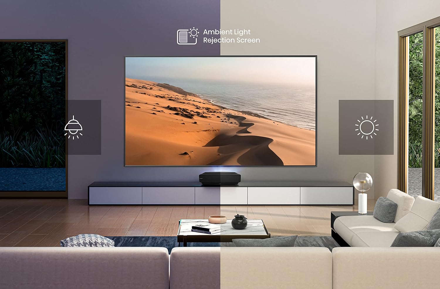 Big Screen in a Small Package. No need for ceiling mounts or in-wall cable runs, simply place the L5G on a TV stand just 11 inches from the wall and get a massive 100-inch projection – that’s 3x more screen than a 55-inch TV.