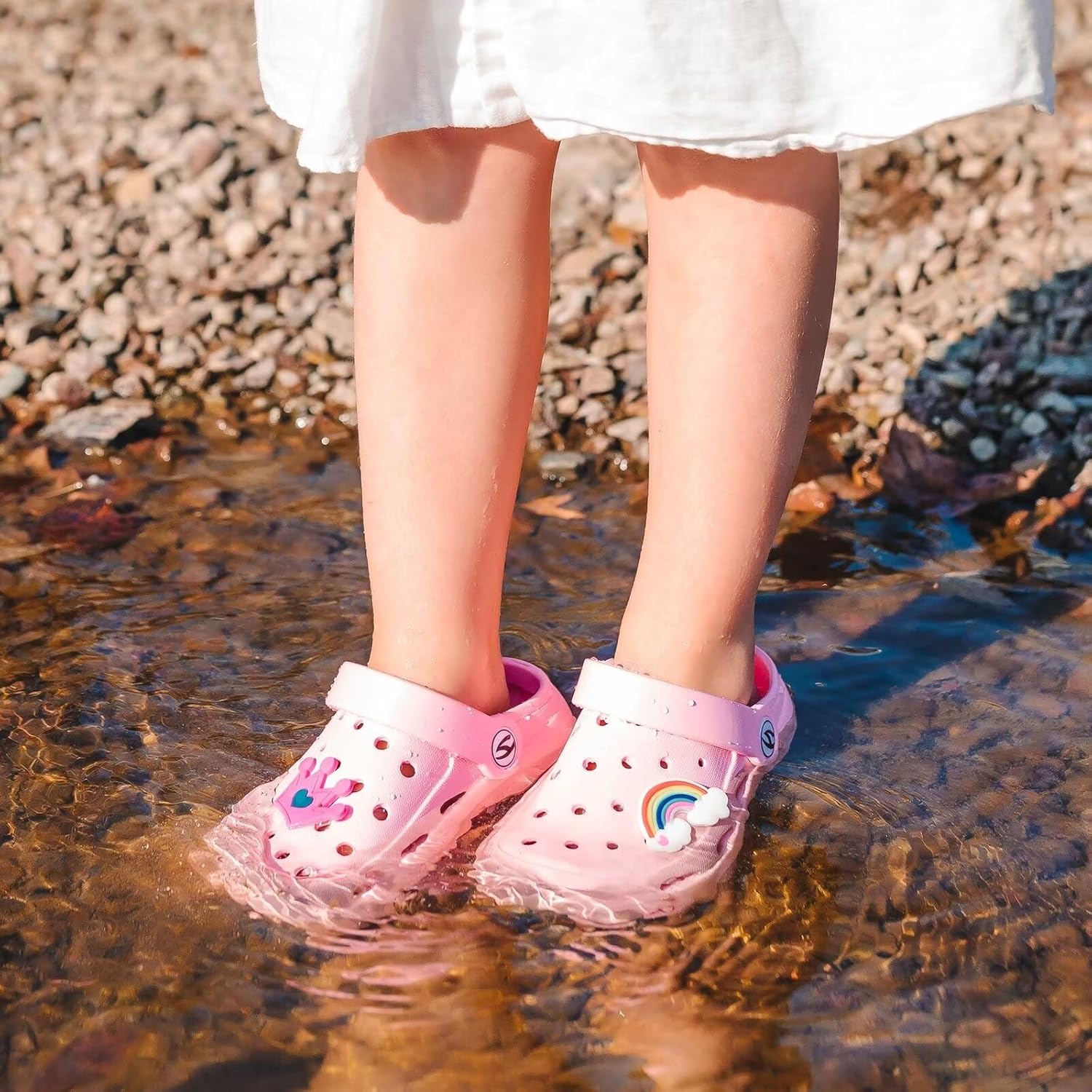 Offering a couple of cute shoe charms that can be accessorized to your childs’ preferences,these clogs go well with anything from jeans to shorts to dresses.
