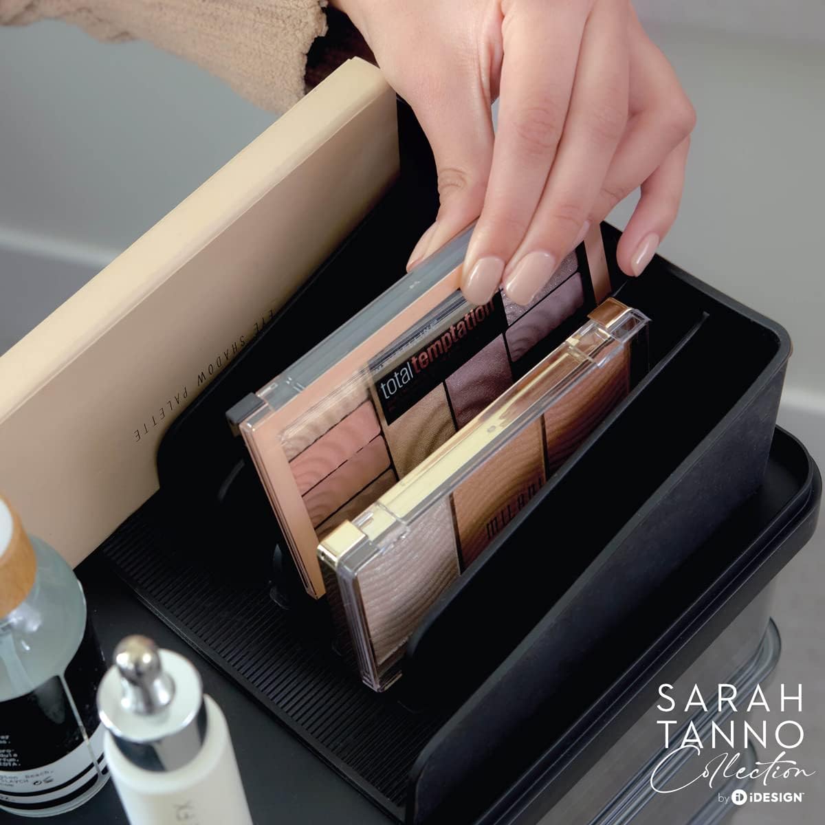 SILICONE MAKEUP PALETTE HOLDER – The Side Palette Organizer from The Sarah Tanno Collection by iDesign makes organizing a breeze by securing palettes in the upright position, so they won’t move around as you open and close drawers.