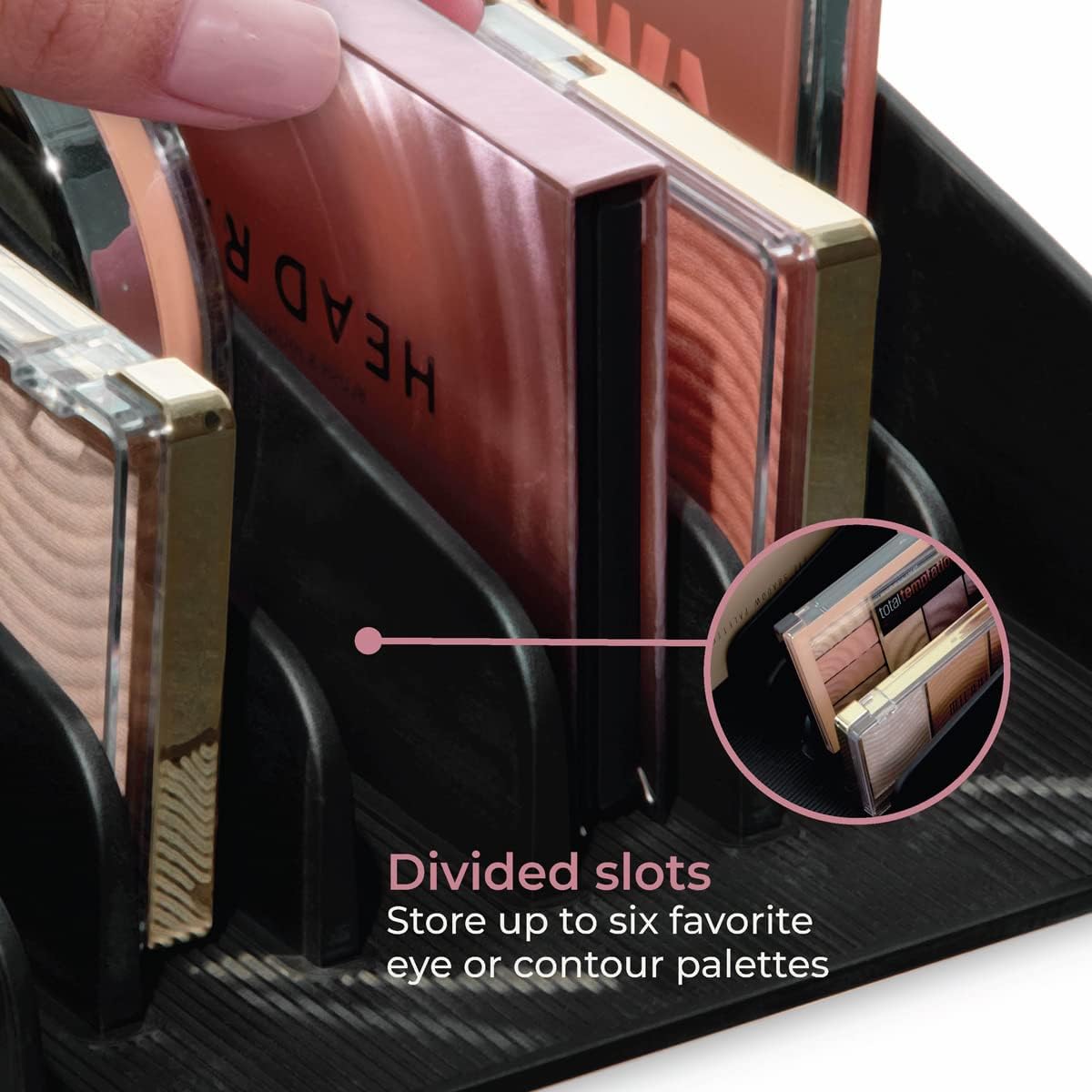 STYLISHLY FUNCTIONAL – With 6 divided slots, you can store a variety of palettes of ranging shapes and sizes such as eyeshadow palettes, contouring palettes, blush palettes, lip kits, eyebrow kits, and more.