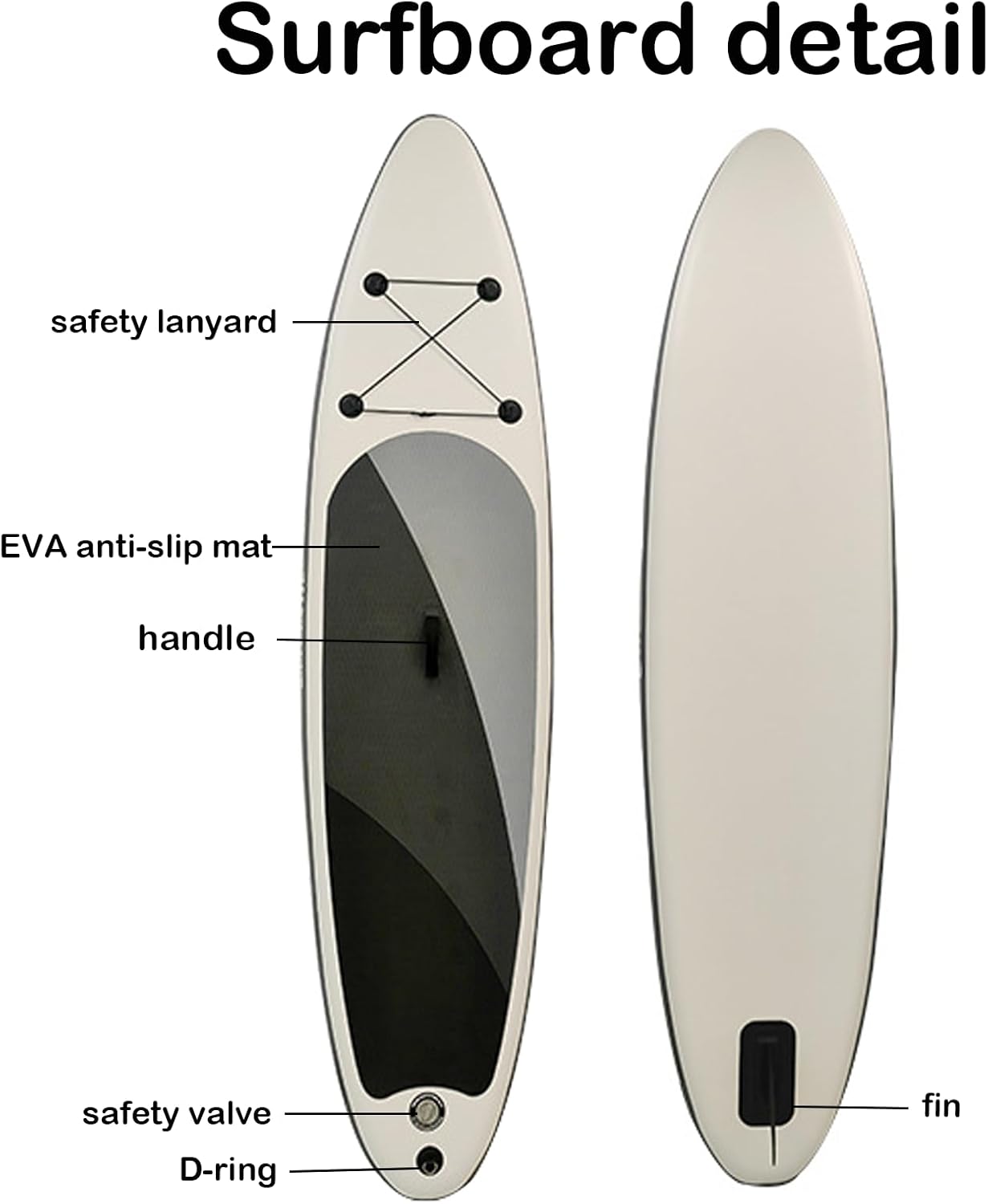Surfing board:A complete set of accessories, including surfboard, adjustable aluminum paddle, high-pressure pump, travel backpack, coil belt, and 1 detachable fin, fully meets the various needs of surfing enthusiasts. With one purchase, you can have complete equipment.