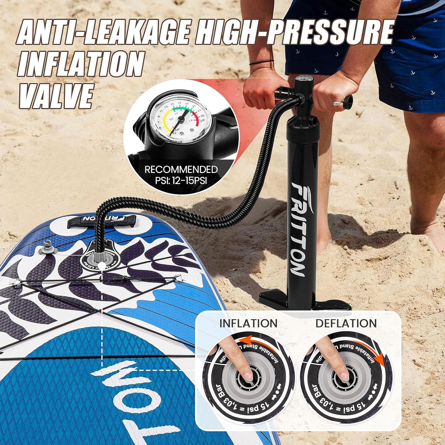 🌊【Premium PVC & Anti-slip EVA material】 FRITTON paddle boards for adults are made of premium ultra-light PVC material, which has excellent wear resistance and long life. With advanced needle-drop core tech and high-pressure valves, you can inflate your paddle board to the hardness of a rock! In addition, the inflatable paddle board surface is equipped with a widened 5mm thick EVA deck, which allows you to stay comfortable on the paddle board and has a non-slip effect.