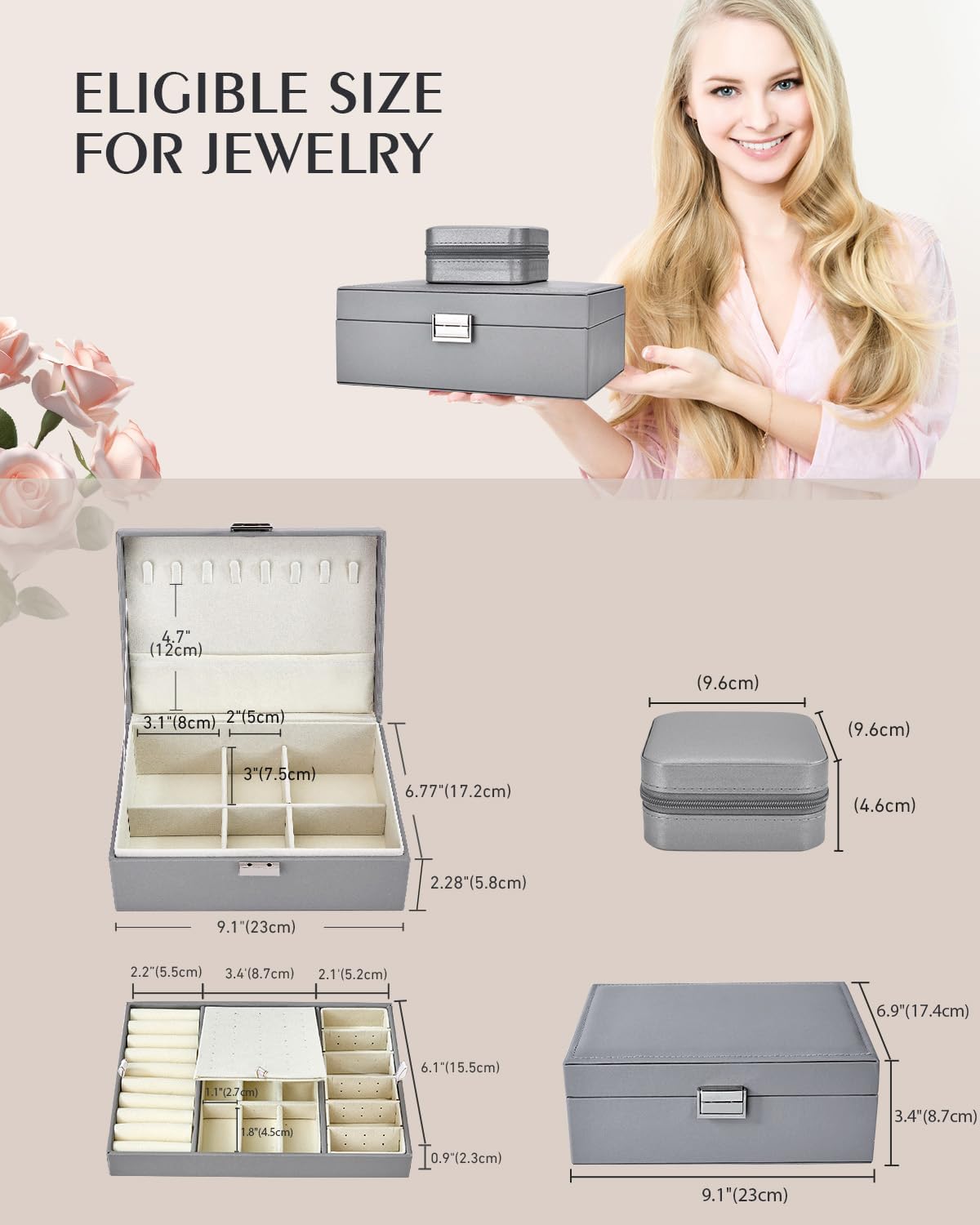 Jewelry Box Organizer for Women – 2 Layer Jewelry Organizer Set with Small Travel Jewelry Case for Girls Ring Earring Necklace Bracelet, PU Leather Jewelry Boxes with Removable Tray (Grey)