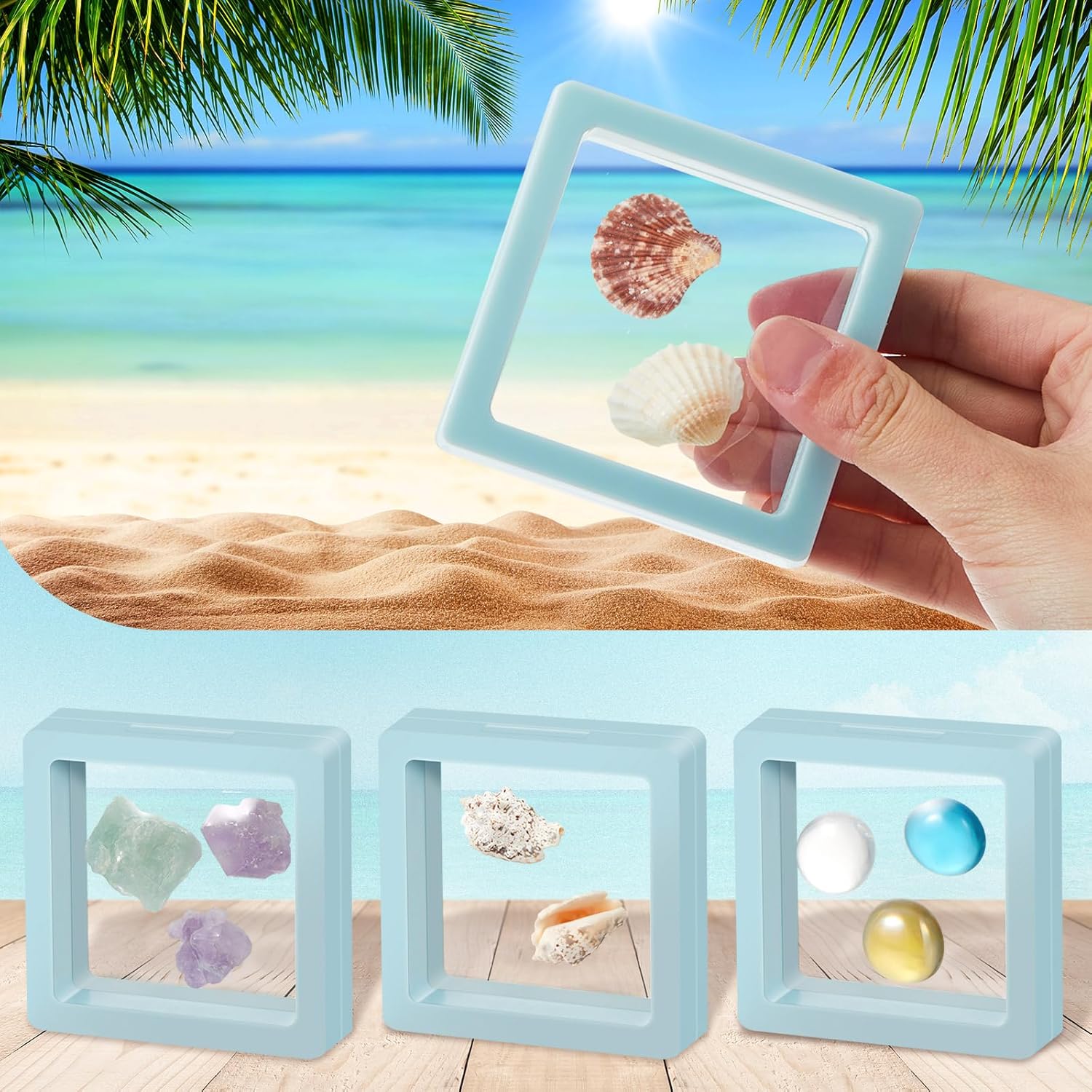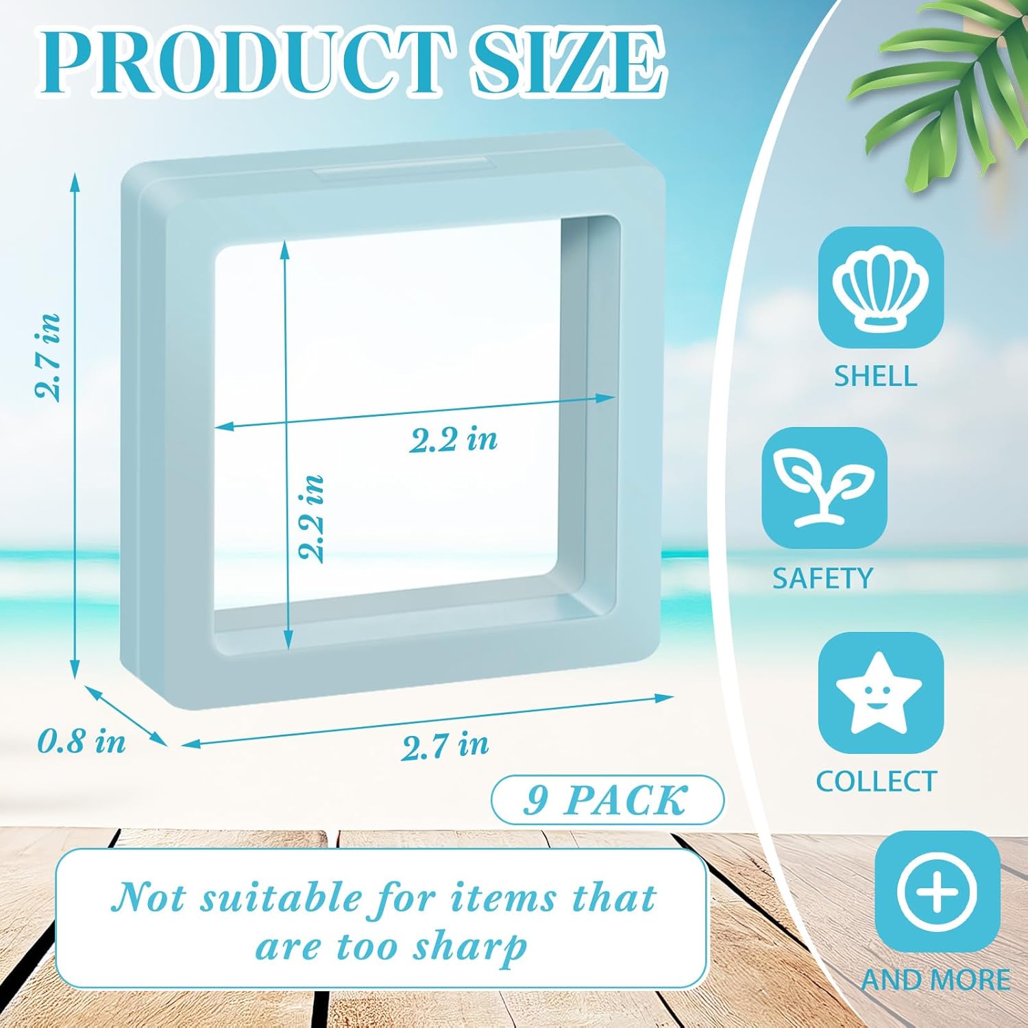 Juexica 9 Pcs Seashell Holder 3D Floating Display Box 2.7 x 2.7 Inches Transparent Display Shelf Cases for Sea Shell Collectibles, Crystal Rock, Diamonds, Jewelry, Badges Decoration(Light Blue)