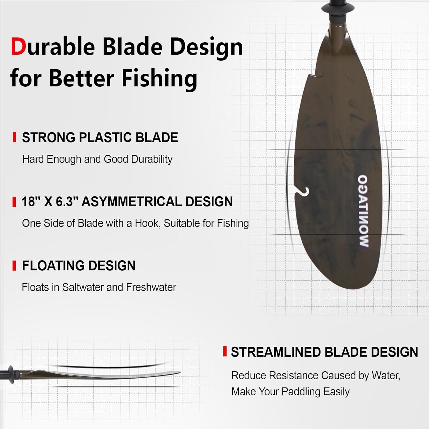 PLASTIC BLADE — Our paddle blades have good durability and corrosion resistance, float in saltwater and freshwater. One side of the blade with a hook, suitable for fishing. The streamlined design adds power and stability to the kayaking while reducing flutter of the paddle