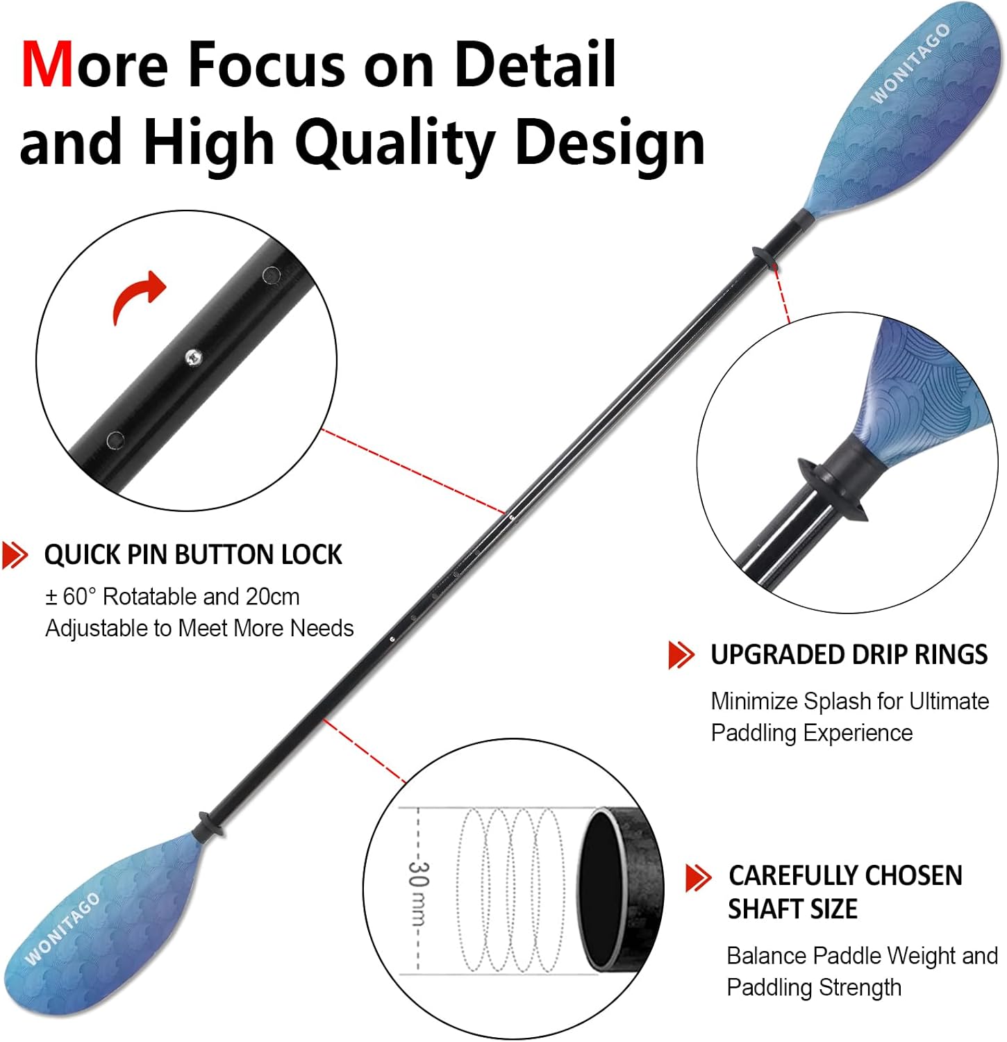 WHY CHOOSE WONITAGO — Our kayak oars reduce fatigue and maximize performance, allowing you to paddle for longer without discomfort. So, whether you’re exploring the coast, racing down a river, or enjoying a peaceful lake, our kayak paddles are the perfect choice for your next adventure