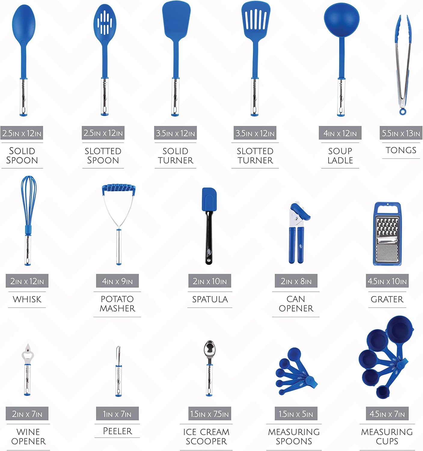 Cooking Utensils Set Includes: Soup Ladle, Solid Spoon, Slotted Spoon, Solid Turner, Slotted Turner, Potato Pusher, Whisk, Can Opener, Grater, Spatula, Tongs, Ice Scream Scooper, Wine Opener, Peeler, Measuring Cups, Measuring Spoons.