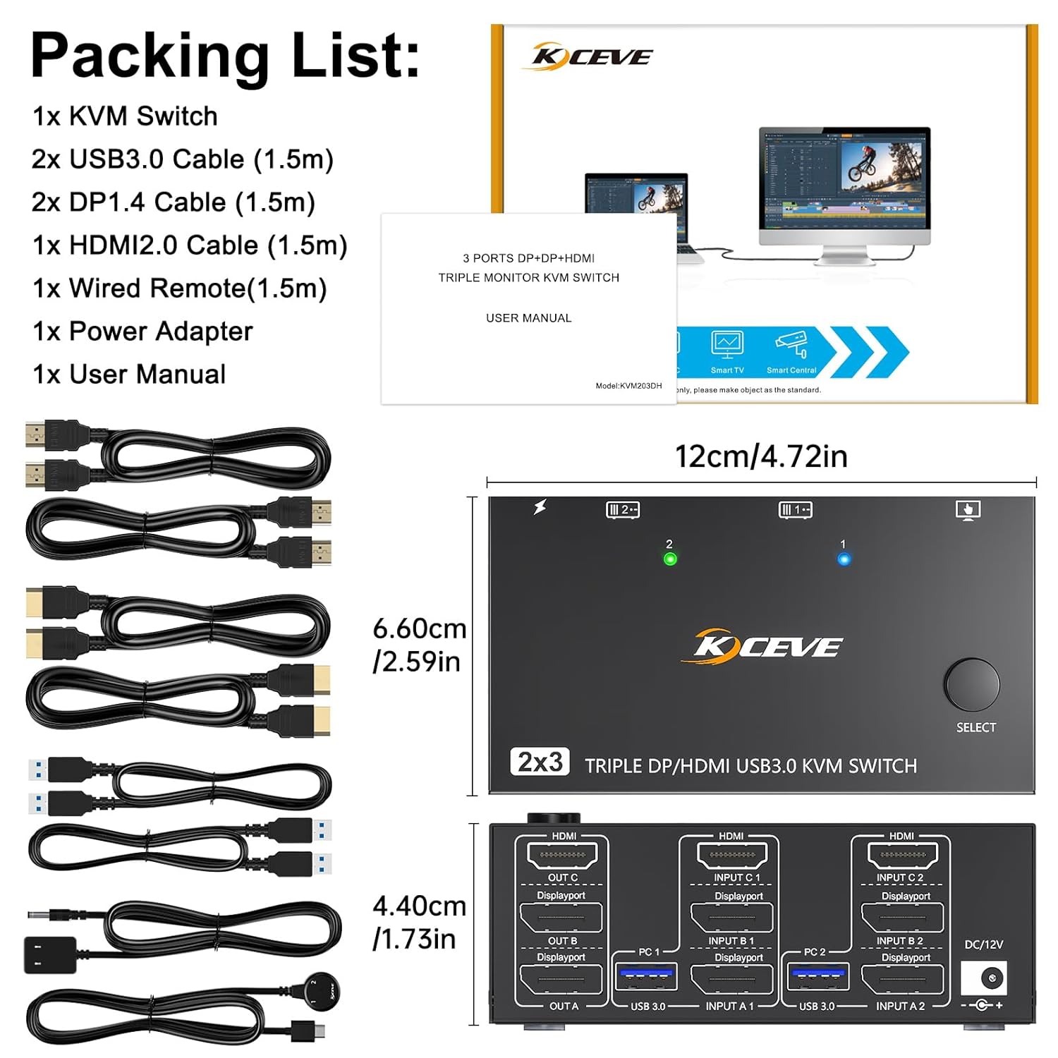 𝐖𝐡𝐚𝐭 𝐘𝐨𝐮 𝐆𝐞𝐭 — 1x Triple Monitor KVM Switch, 2x DP1.4 Cable, 1x HDMI2.1 Cable, 2x USB 3.0 Cable, 1x Power Adapter, 1x Wired remote, 1x User’s manual. 12 months warranty. If you have any questions about the product, please contact us.